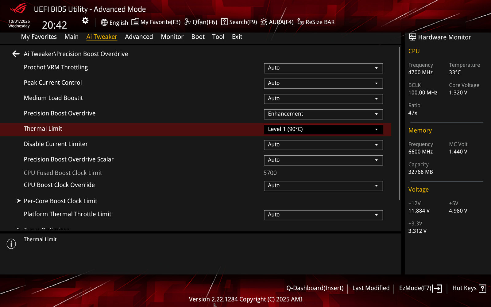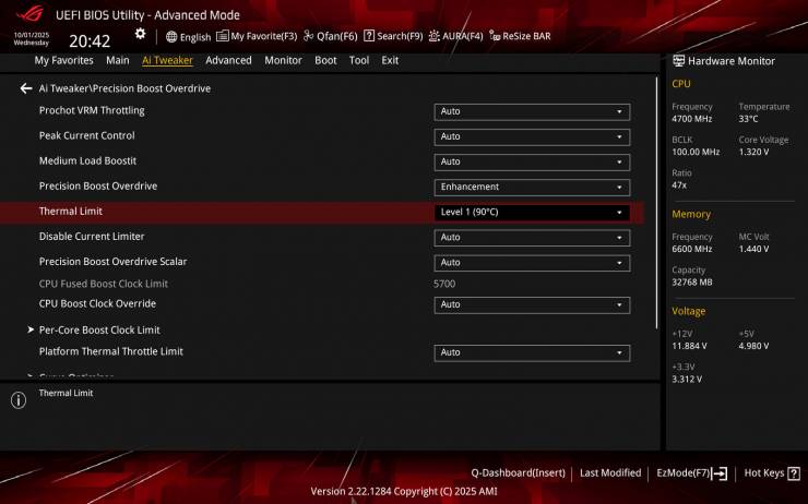 Для этого мы установили предел критической температуры на уровне 90°C, выбрав соответствующий пункт в BIOS: Precision Boost Overdrive – Thermal Limit – Level 1 (90°C).