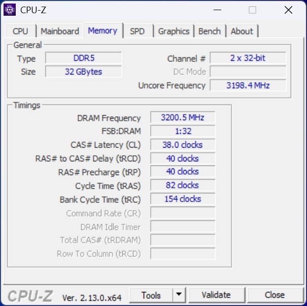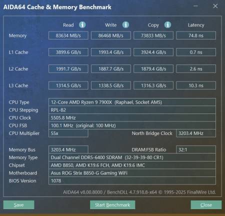 После повышения каждого из таймингов на 2 до 38-40-40-82 и увеличения напряжения до 1,38 В модули заработали в режиме DDR5-6400. В AIDA64 это дало прирост пропускной способности на 7-9% при одновременно на 8% более высокой латентности. Зато частота Uncore Frequency выросла до 3200 МГц, а не снизилась до 1600 МГц, как это происходит обычно. В случае с данной платой такое падение производительности имело место только в режиме DDR5-6600.