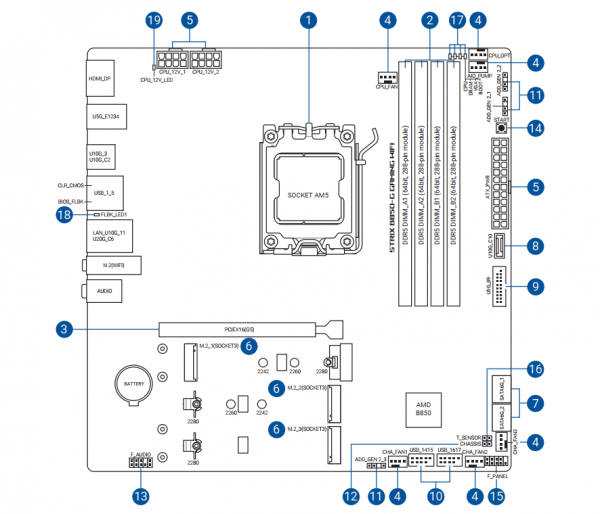 Хотя материнская плата ASUS ROG STRIX B850-G GAMING WIFI выполнена в сравнительно компактном форм-факторе microATX, производитель позаботился о ее должной функциональности.