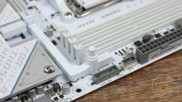 Сами четыре DIMM-слота предназначены для памяти стандарта DDR5 со скоростью до 8000+ МТ/с и объемом до 256 ГБ. Фиксаторы здесь только сверху, что упростит установку и извлечение планок.