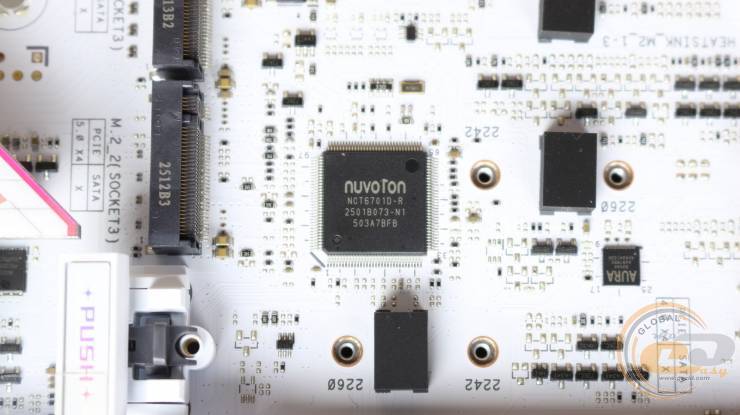 Мультиконтроллер материнской платы ASUS ROG STRIX B850-G GAMING WIFI поместился рядом со слотами M.2. Здесь используется хорошо знакомый и распространённый чип NUVOTON NCT6701D-R.