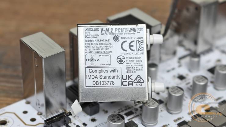 В свою очередь, под кожухом интерфейсной панели расположена PCIe-плата Realtek RTL8922AE, которая привнесла поддержку трехдиапазонного Wi-Fi 7 и Bluetooth 5.4. Напоминаем, что к ней подключается комплектная выносная антенна, также выполненная в белом цвете.
