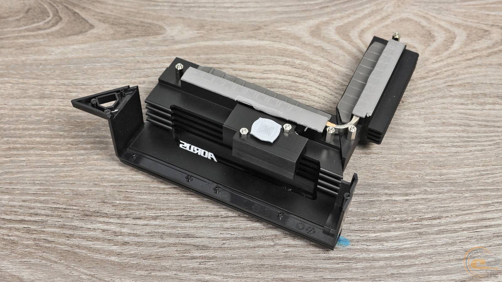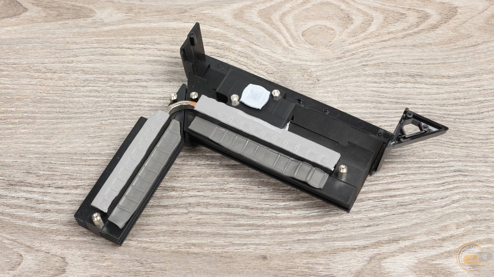 Для лучшей эффективности они дополнены тепловой трубкой, соединяющей их в одно целое. На месте имеются и термопрокладки для отвода тепла от дросселей и транзисторов, в том числе с высокой теплопроводностью 7 Вт/(м·К). Еще один квадратный элемент передает тепло от микросхемы ASMedia, которая отвечает за работу портов USB 4.