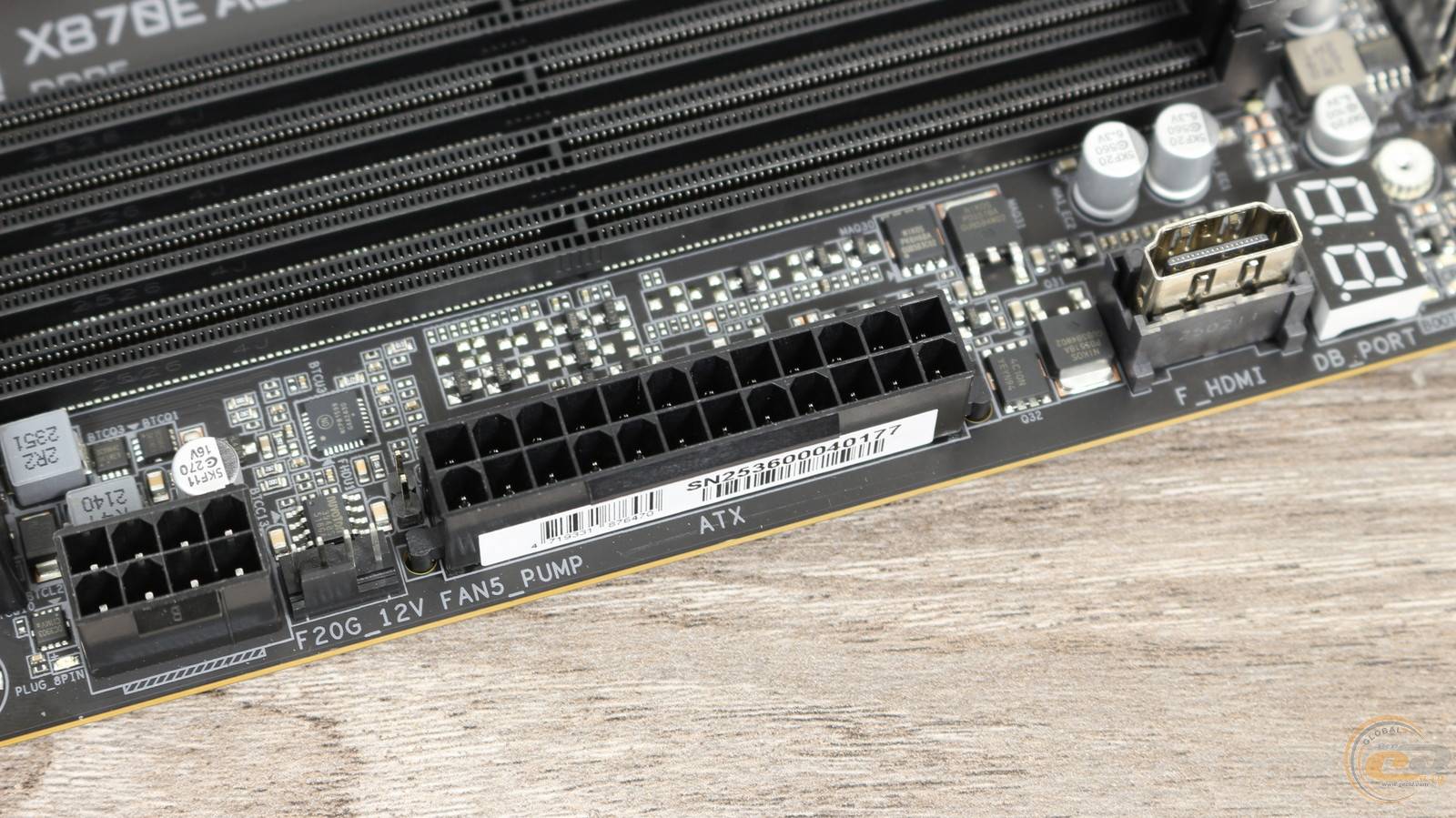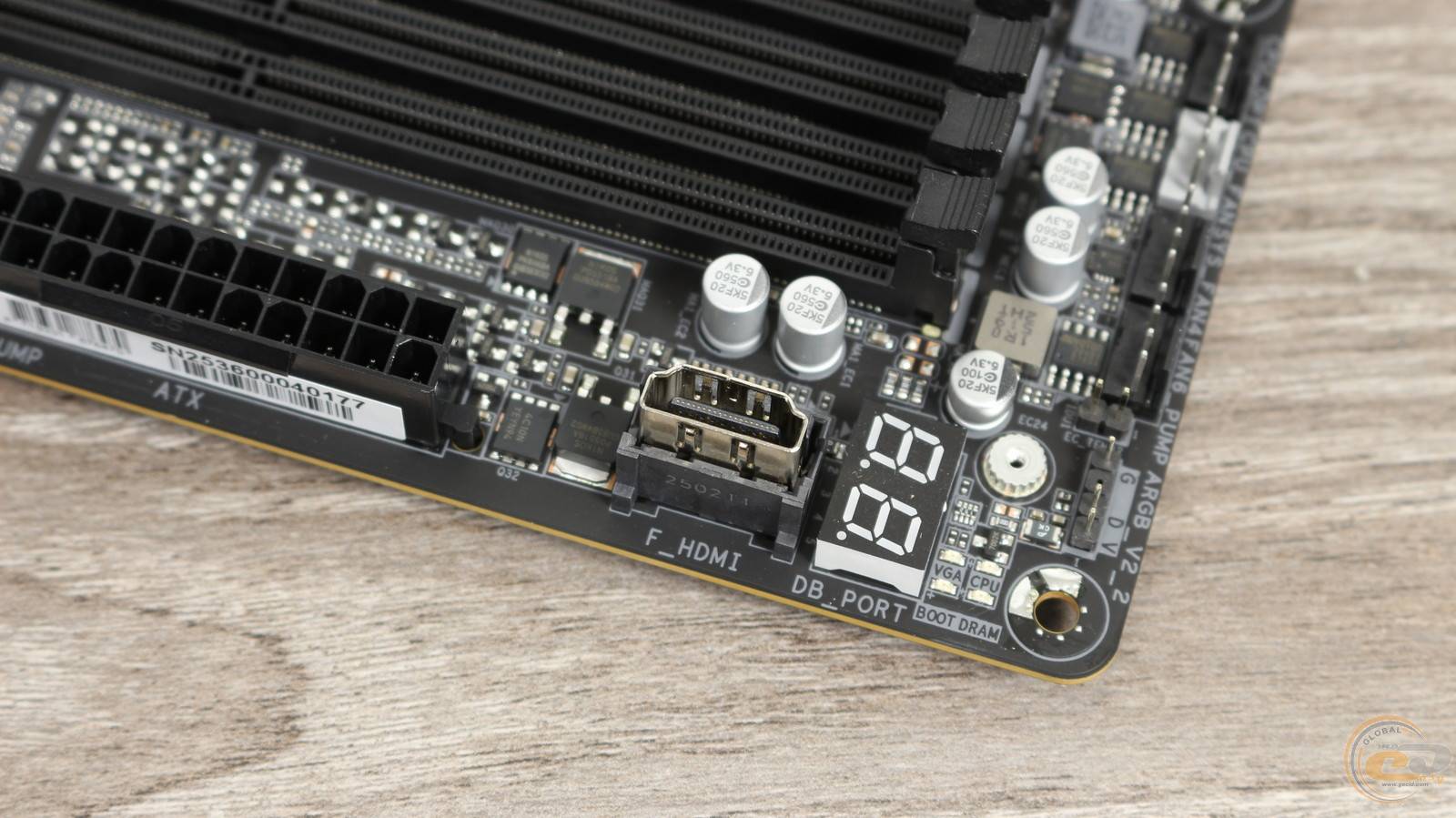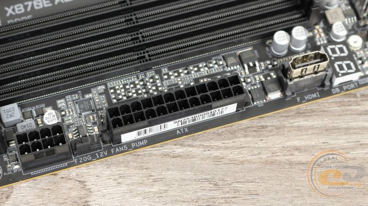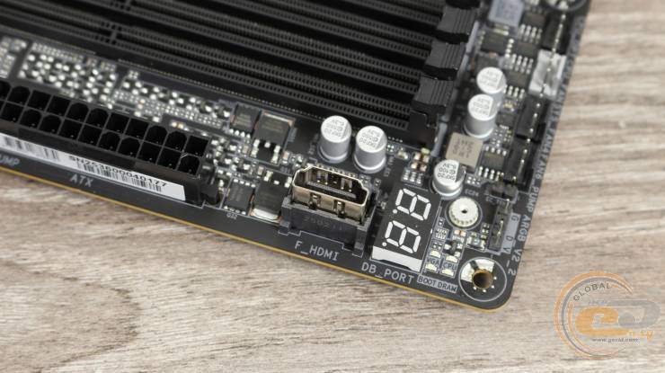 А вдоль правого края распаяна колодка подключения адресной LED-подсветки, четыре индикатора загрузки системы, табло вывода диагностических кодов, разъем HDMI, 24-контактный разъем питания ATX, еще один 4-контактный FAN-коннектор с возможностью подключения помпы и 8-контактный разъем питания PCIe. Подключение последнего позволит использовать расположенный ниже передний порт USB 3.2 Gen 2x2 для быстрой зарядки мощностью до 65 Вт.