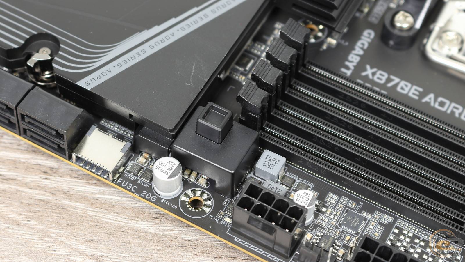 Рядом с нижними фиксаторами видна кнопка, позволяющая одним нажатием вытащить видеокарту из верхнего слота PCIe.
