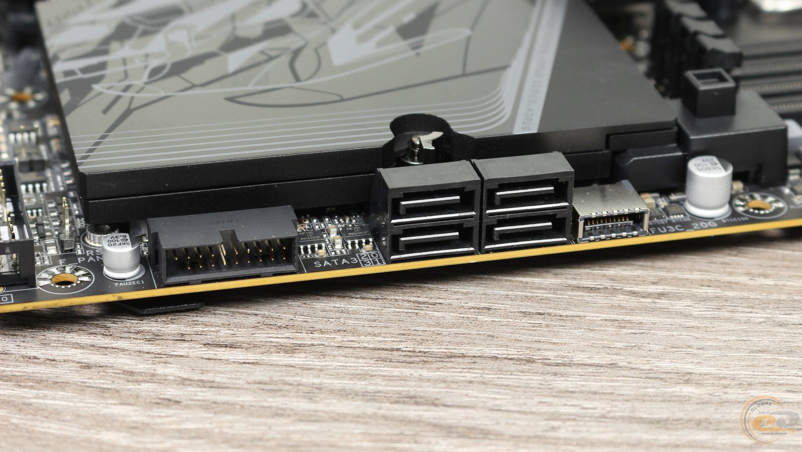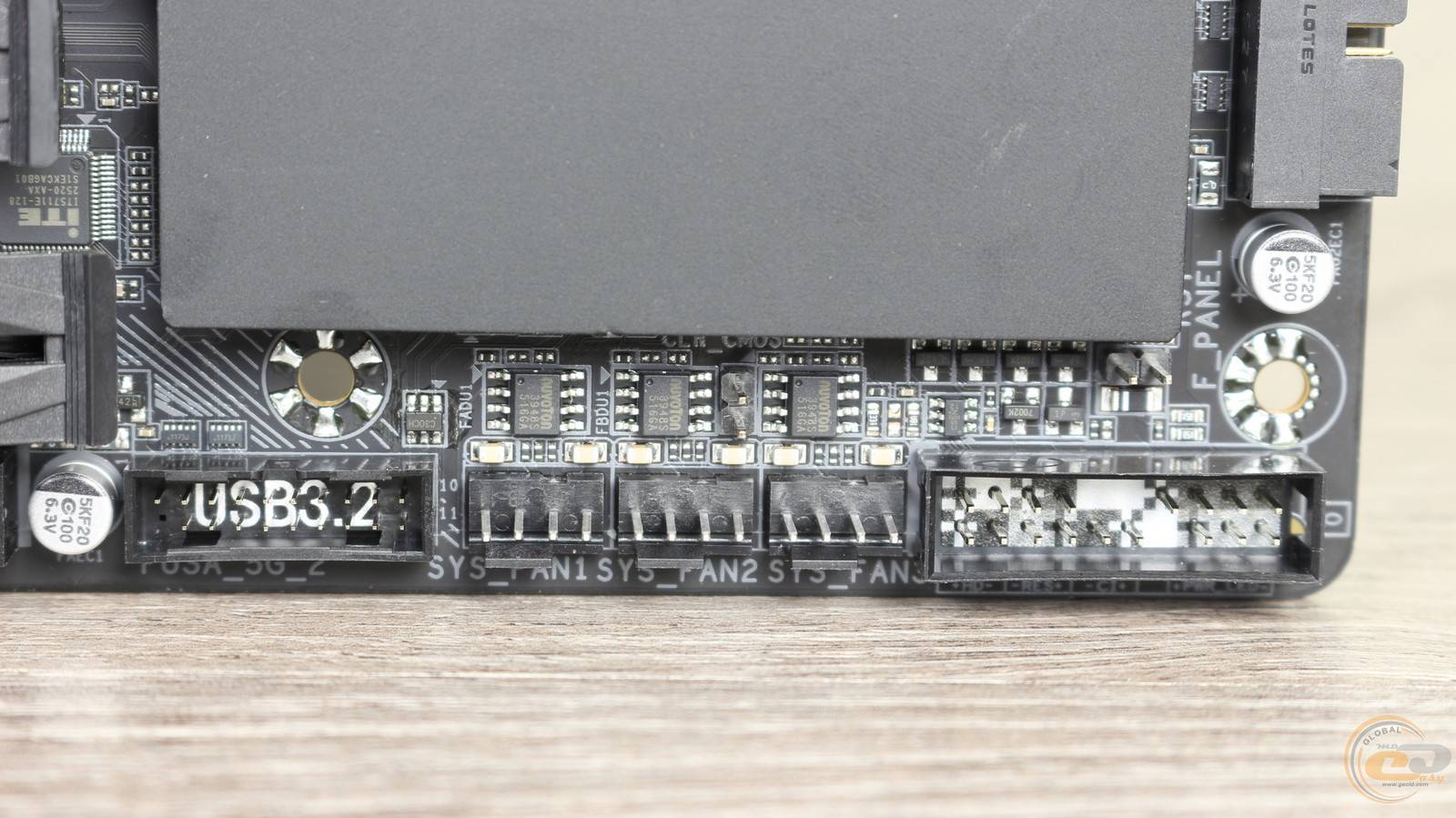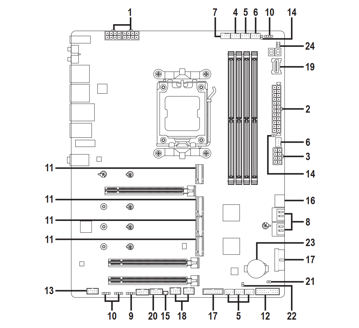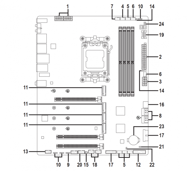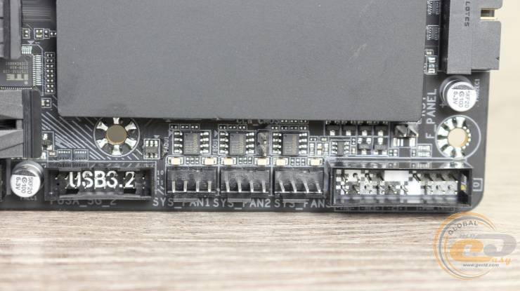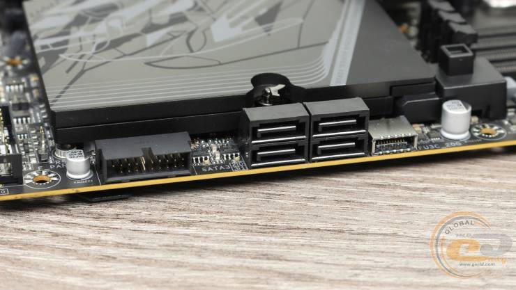 Еще ниже вдоль правого края расположились фронтальные колодки USB 3.2 Gen 2x2 и USB 3.2 Gen 1. Последние предназначены для подключения соответственно USB Type-C с пропускной способностью до 20 Гбит/с и двух USB 3.2 Gen 1 со скоростью 5 Гбит/с. А между ними распаяны четыре порта SATA 6 Гбит/с с горизонтальной компоновкой, что позволит использовать их даже при установке габаритной видеокарты.
