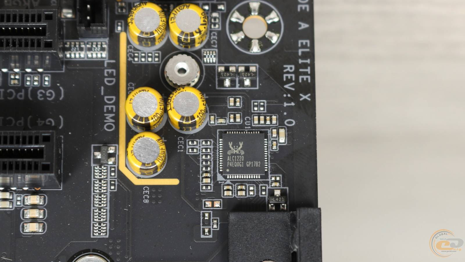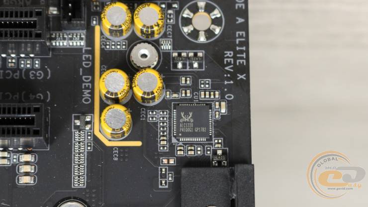 Что ж, опускаемся до самого низа платы. В левом углу распаян аудиокодек Realtek ALC1220 с сопутствующими аудиоконденсаторами, а также колодка передних аудиоразъемов.