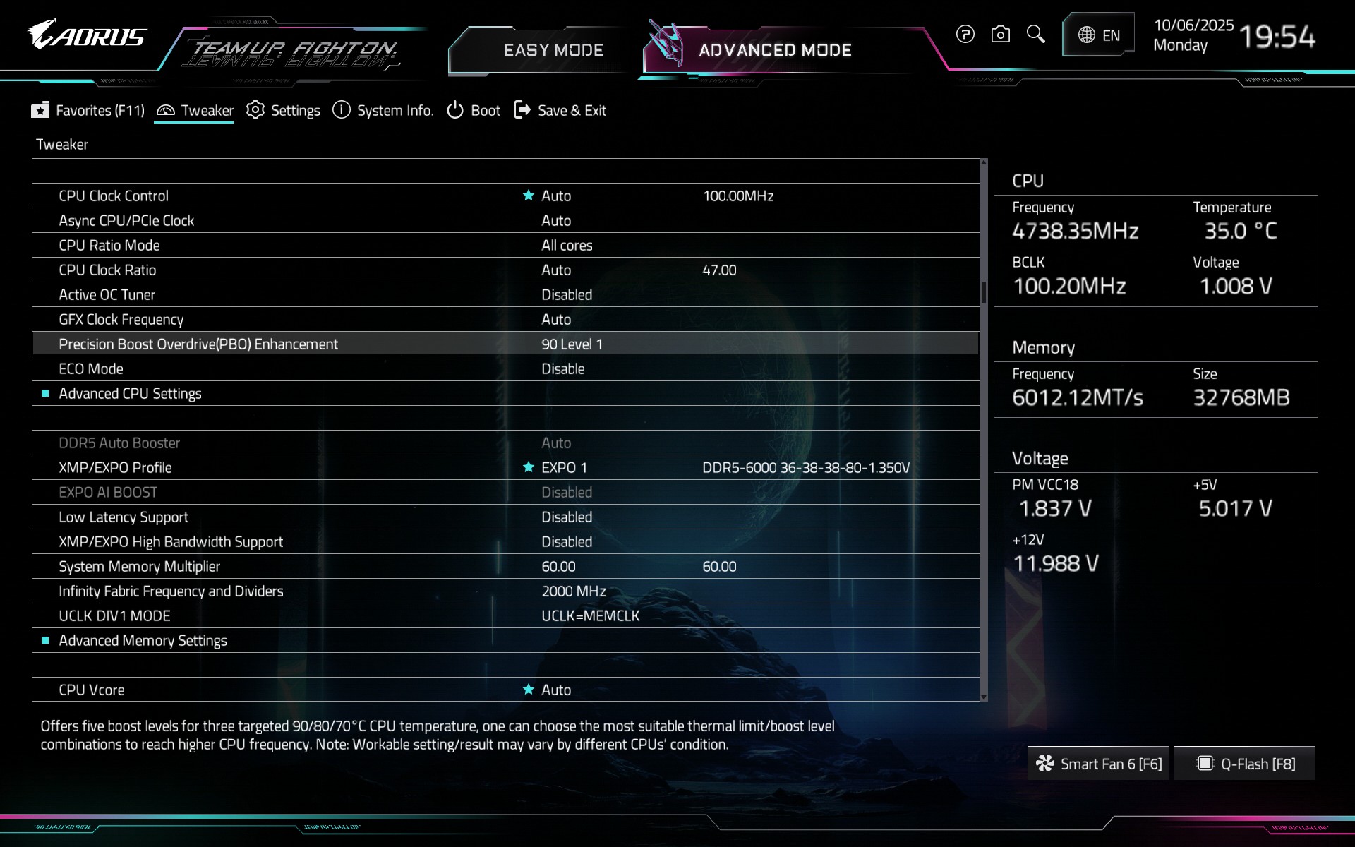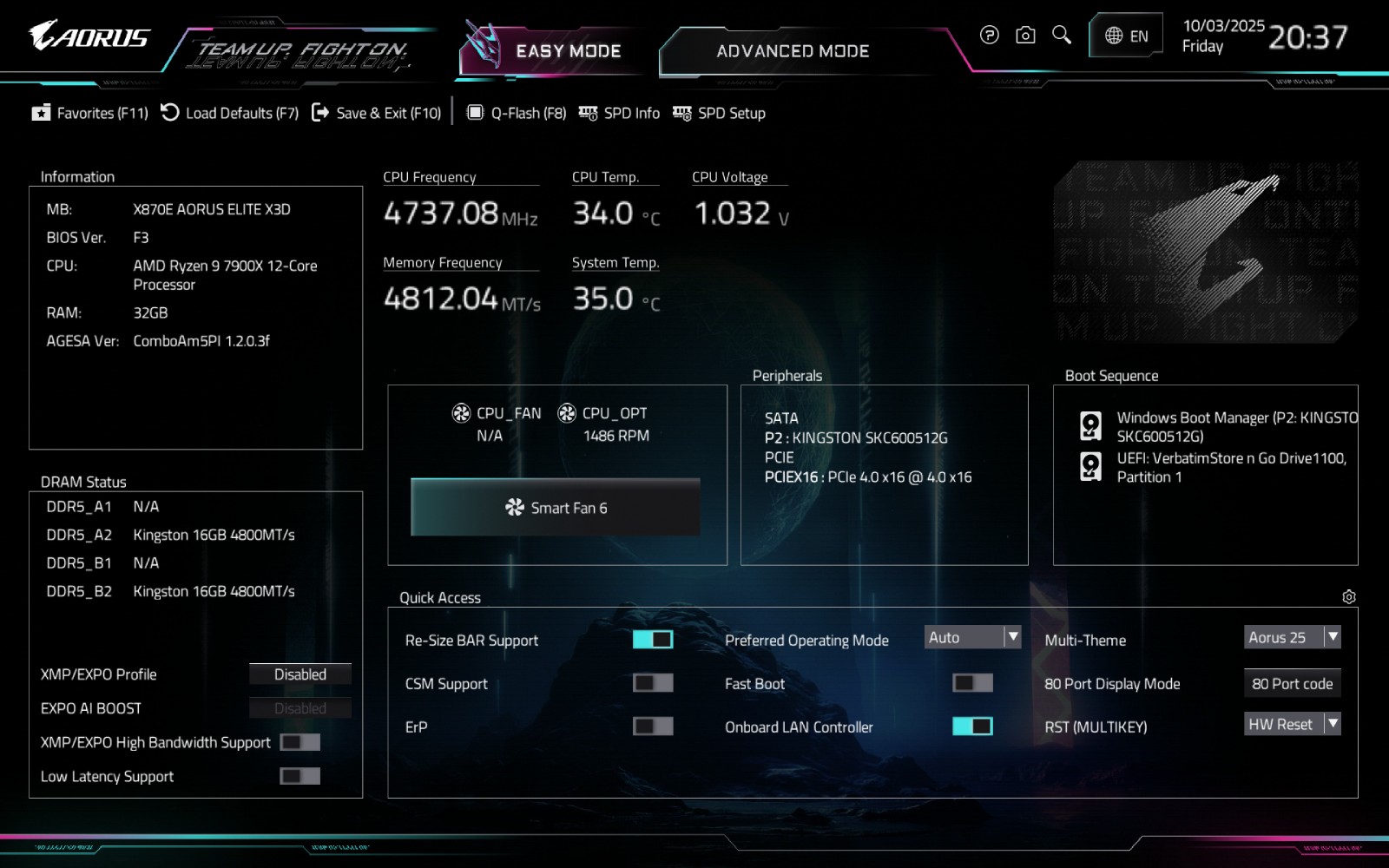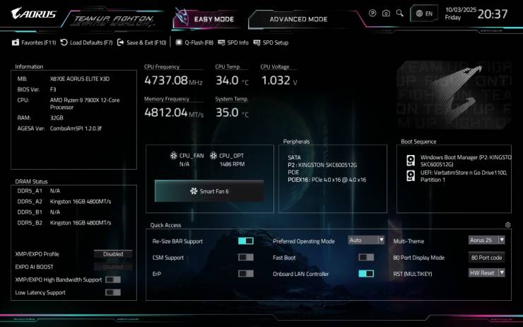 Тестируемая плата GIGABYTE X870E AORUS ELITE X3D использует современный загрузчик на основе графического интерфейса UEFI. Традиционно доступны два режима работы. В «Easy Mode» все настройки сгруппированы на одном экране.