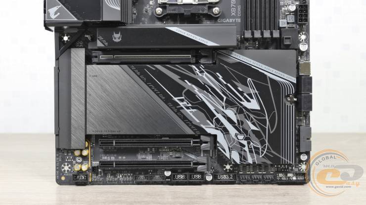 Еще три слота M.2 Socket 3 расположились ниже PCI Express 5.0x16. Верхний из них соответствует стандарту PCIe 5.0 x4, поэтому накопитель также охлаждается с обеих сторон. Впрочем, при задействовании портов USB 4 на тыльной панели для установленного сюда SSD будут доступны только две линии вместо четырех. А в паре с процессорами Ryzen 8000 он и вовсе будет неактивным.