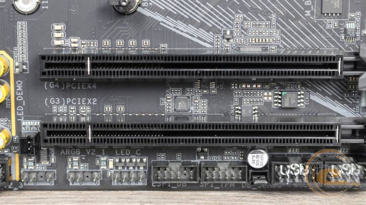 В свою очередь два нижних слота работают благодаря чипсету, поэтому здесь стабильно имеем PCIe 4.0 x4.