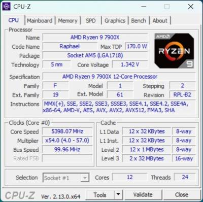При нагрузке 12-ядерного AMD Ryzen 9 7900X стресс-тестом утилиты CPU-Z, он держал стабильные 5,35 ГГц при напряжении 1,265 В.
