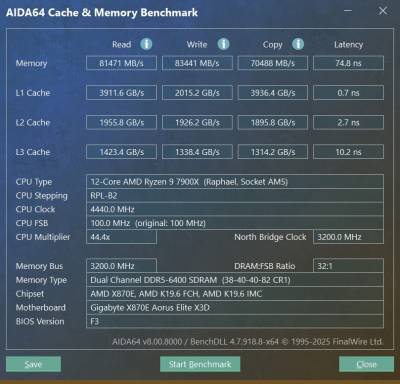 После повышения каждого из таймингов на 2 до 38-40-40-82 и увеличения напряжения до 1,38 В модули заработали в режиме DDR5-6400. В AIDA64 это дало прирост пропускной способности на 4-6% при одновременно на 12% меньшей латентности. Так и частота Uncore Frequency выросла до 3200 МГц. Такая манипуляция способна внести свой вклад в увеличение быстродействия системы.
