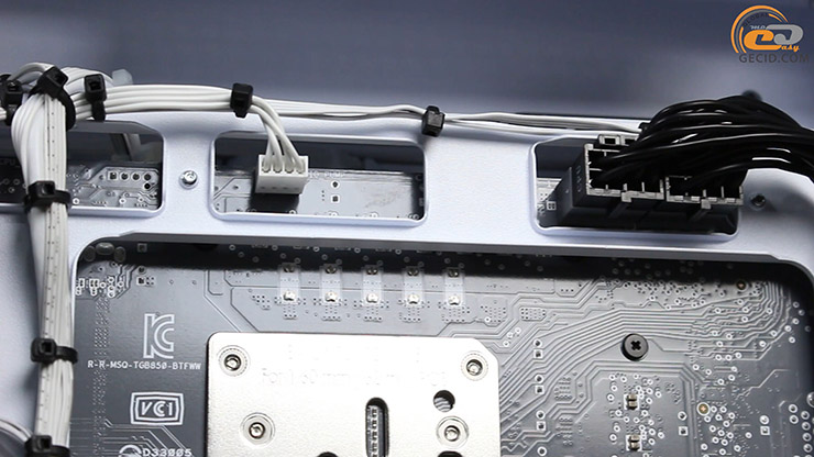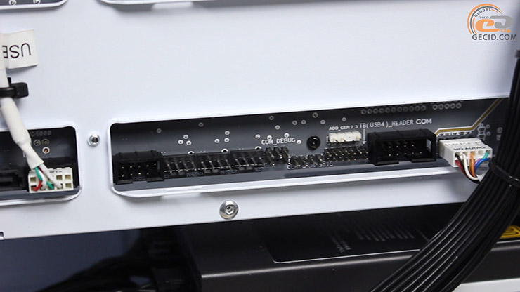 Здесь оказались и интерфейсы питания, и SATA, и внутренние USB, а также новый GC_HPWR для видеокарт, способный передать до 600 Вт мощности. Лишь коннектор для кулера процессора остался на лицевой части самой платы.