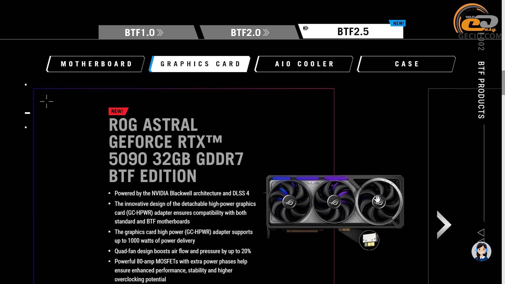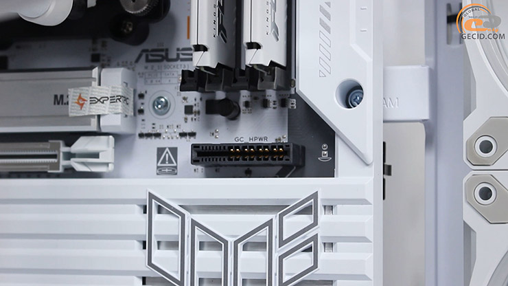 Модель относится к концепции BTF 2.5, предусматривающей использование съемного адаптера GC-HPWR, способного выдерживать нагрузку до 1000 Вт, и сохранение привычного разъема 12VHPWR – совместимая заглушка идет в комплекте.