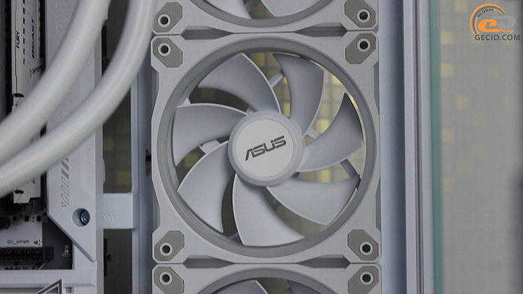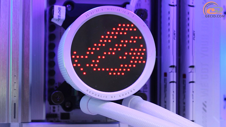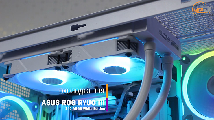 Охлаждает процессор эффектная система жидкостного охлаждения ASUS ROG RYUO III 240 ARGB White Edition, которая совместима с платформой, хотя и не рекомендована к BTF-системам. Она получила 240-миллиметровый радиатор улучшенной конструкции, пару 120-мм ARGB-вентиляторов и новый водоблок с 3,5-дюймовым цветным дисплеем Anime Matrix для отображения эксклюзивной анимации, параметров системы или собственного контента.