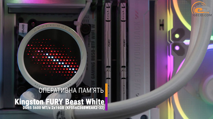 За хранение оперативных данных отвечает пара модулей Kingston FURY Beast White DDR5 общим объемом 32 ГБ со скоростью 5600 МТ/с и приемлемыми таймингами. Модули обладают стильным белым радиатором и поддержкой профилей AMD EXPO, то есть оптимизированы именно под эту платформу. Мы решили ее немного ускорить до оптимальных 6000 МТ/c, что получилось сделать при таймингах 36-44-44 и напряжении 1,35 В.