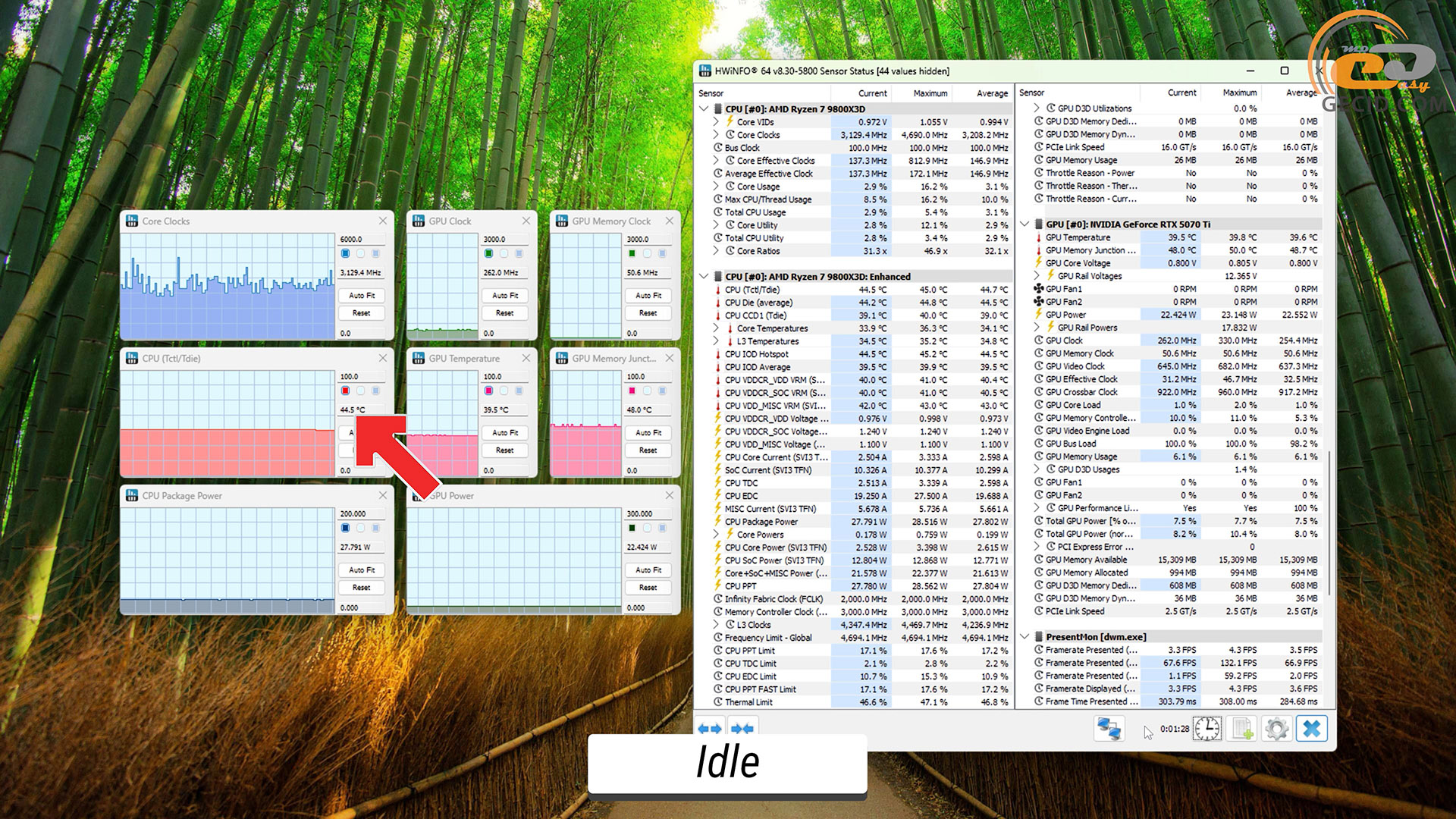 Во время простоя видеокарта и процессор находились в покое и грелись до 37 и 44 с поливной градуса соответственно. Никаких неожиданностей здесь нет.