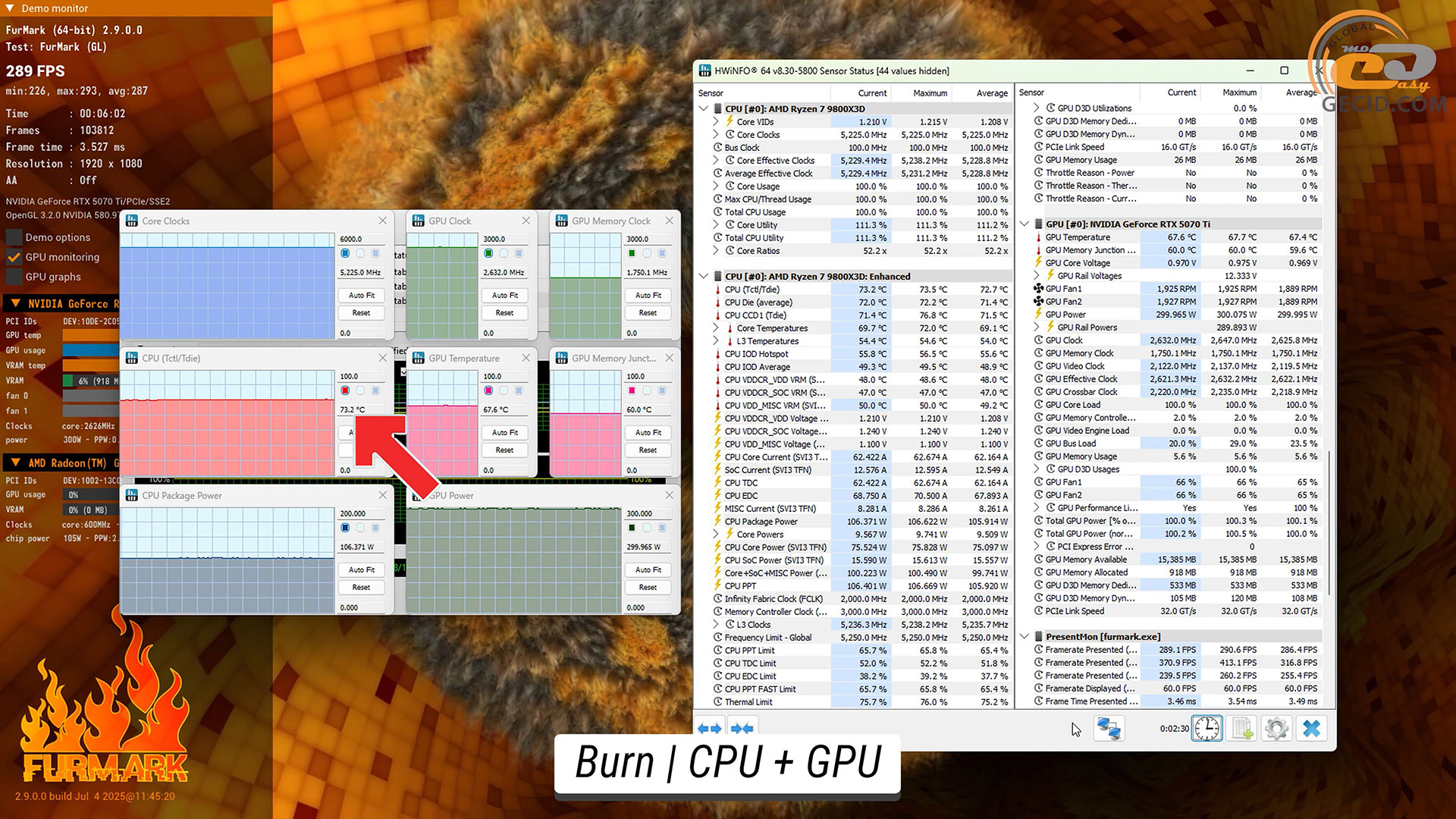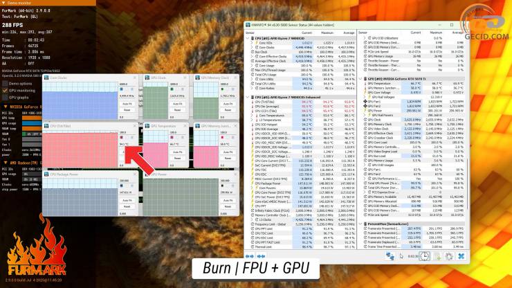 При преодолении испытаний от FurMark с нагрузкой FPU процессора и видеокарты первый разогрелся до достаточно высокого уровня в 94 градуса Цельсия. Что касается графического ускорителя, то его температура намного ниже – около 66 градусов при рабочей частоте в 2625 МГц, при 58 градусах на чипах видеопамяти.