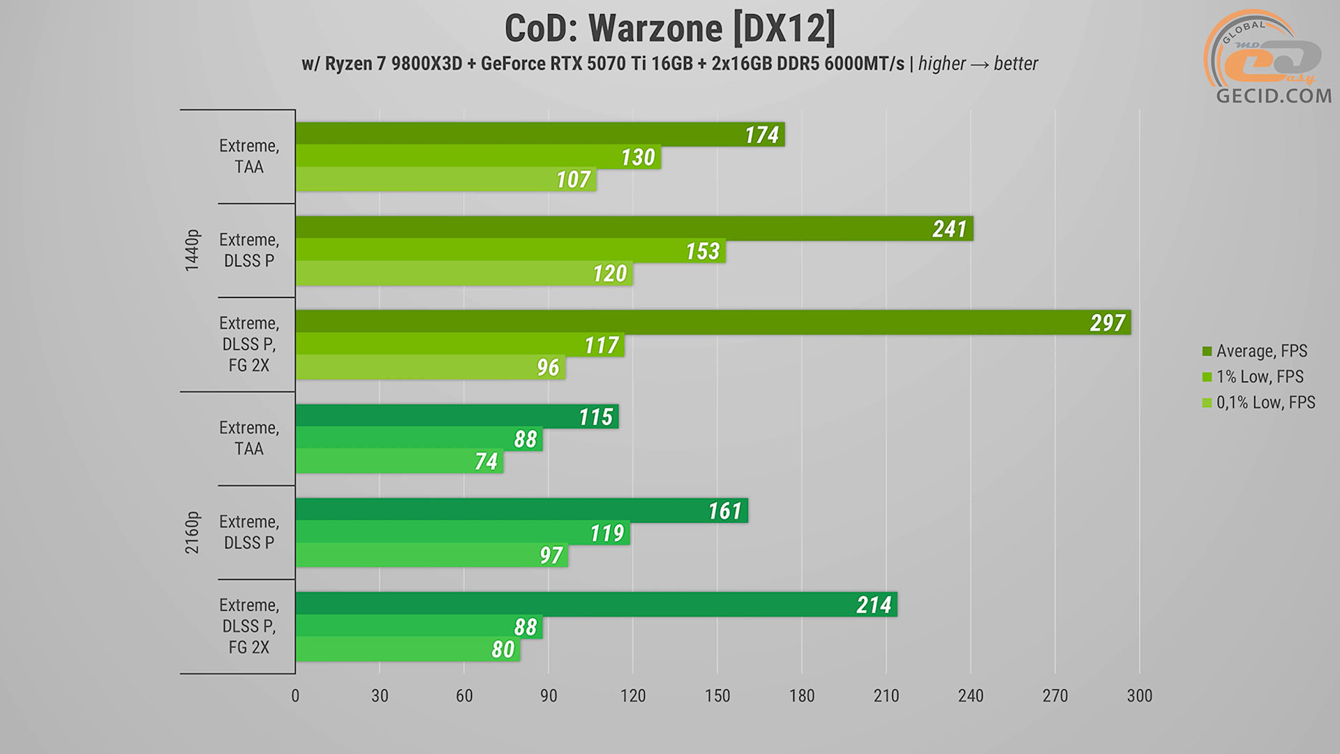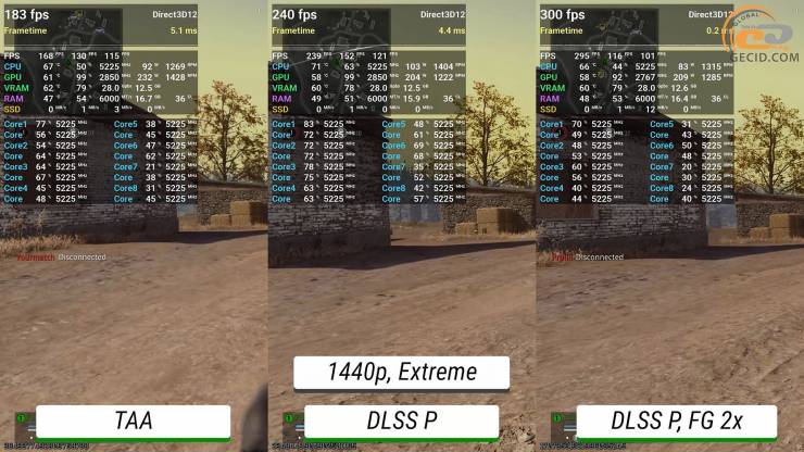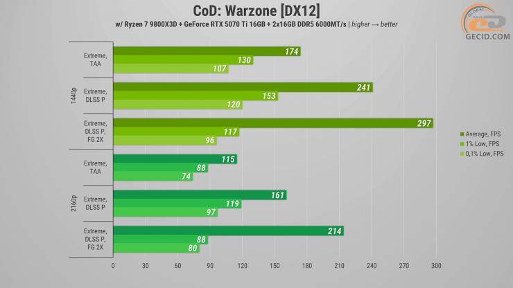 В Call of Duty: Warzone на экстремальном пресете графики в разрешении Quad HD геймплей во время перебежек по Верданску остается на абсолютно достаточном уровне. Активация апскейлера увеличивает частоту обновления экрана до 240 кадров в секунду. А при использовании двухкратного генератора кадров упираемся в предел движка по частоте кадров и останавливаемся на уровне в 300 FPS.
