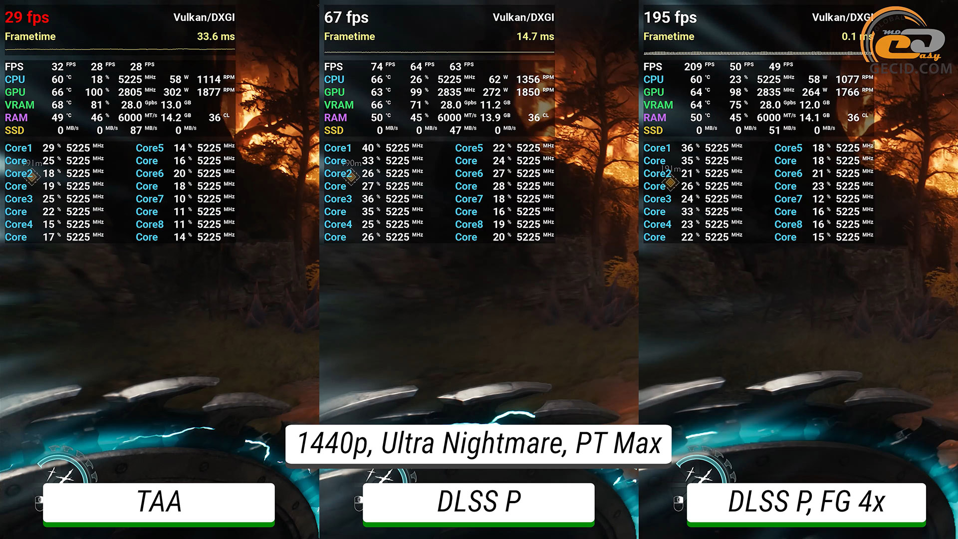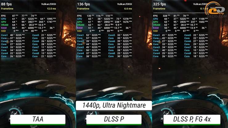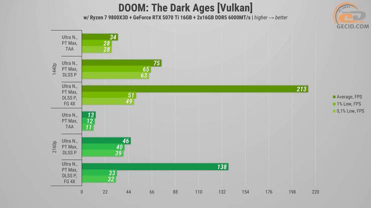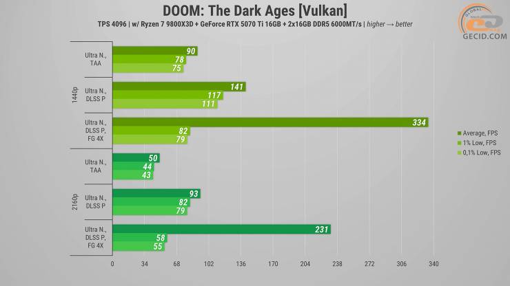 Рубить врагов в DOOM: The Dark Ages в 1440p и максимально доступном пресете графики "Ультра Кошмар" можно с удовольствием при любом раскладе – производительности видеокарты вполне хватает и без DLSS. Активация же апскейлера ожидаемо ускоряет рендер почти в полтора раза. А четырехкратный генератор кадров выводит частоту обновления экрана на уровень более 300 раз в секунду.