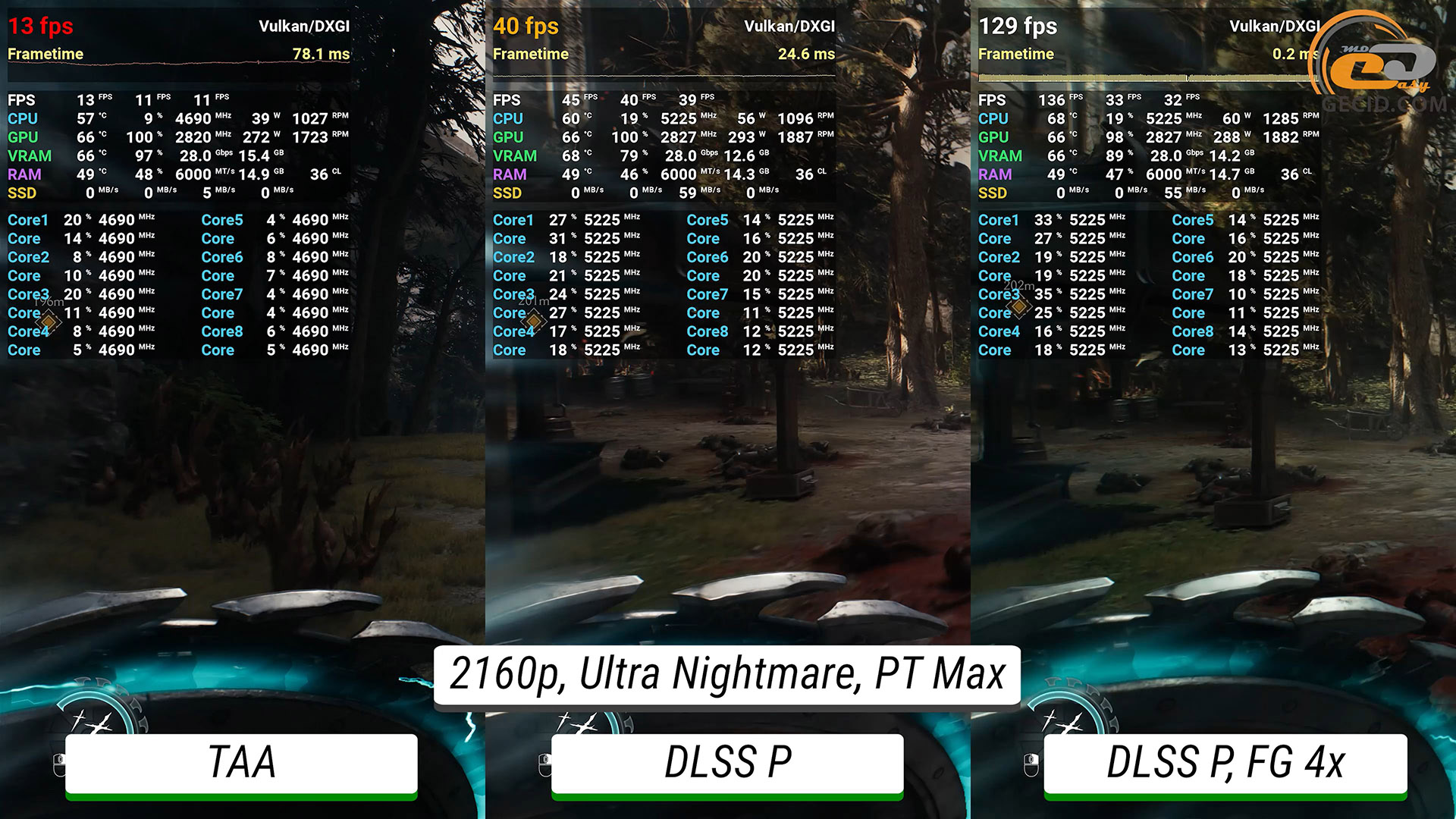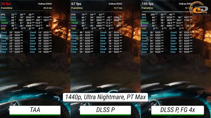 Максимальная трассировка пути становится уже почти неподъемной для графического ускорителя без добавления каких-либо технологий ускорения – едва получается иметь 30 FPS. После активации DLSS в производительном режиме геймплей становится приятным, а после переключения фрейм-генератора в 4К система позволяет получить более 200 FPS, при этом иметь идеальное управление и не очень отличающуюся от оригинальной картинку.
