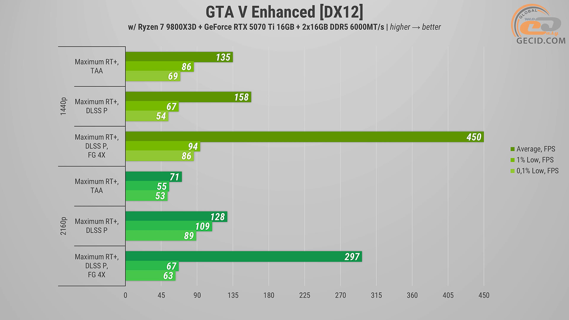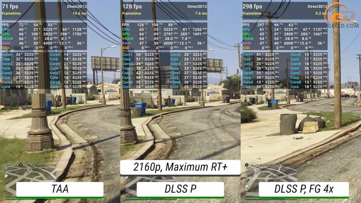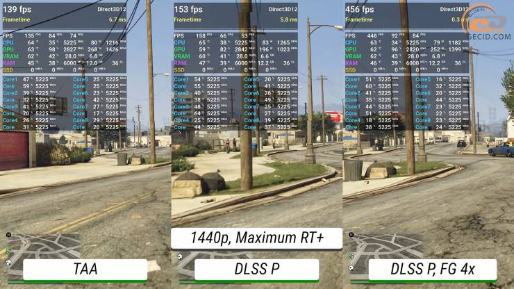 Улучшенная версия GTA V недавно получила обновление, в котором разработчики добавили поддержку DLSS4 и генерацию кадров до уровня 4X. Следовательно, стоит также посмотреть, как здесь себя чувствует система. В процессе езды по летниму Лос-Сантосу в Quad HD во всех трех случаях имеем абсолютно достаточный запас частоты кадров на максимальном пресете графики. Однако следует отметить, что при добавлении производительного режима DLSS сильного прироста частоты кадров не наблюдается, а вот показатель очень редких событий сигнализирует о более заметных просадках и появлении некоторых подергиваний. А вот генератор кадров позволяет получить очень плавную картинку с почти незаметными намеками на артефакты.