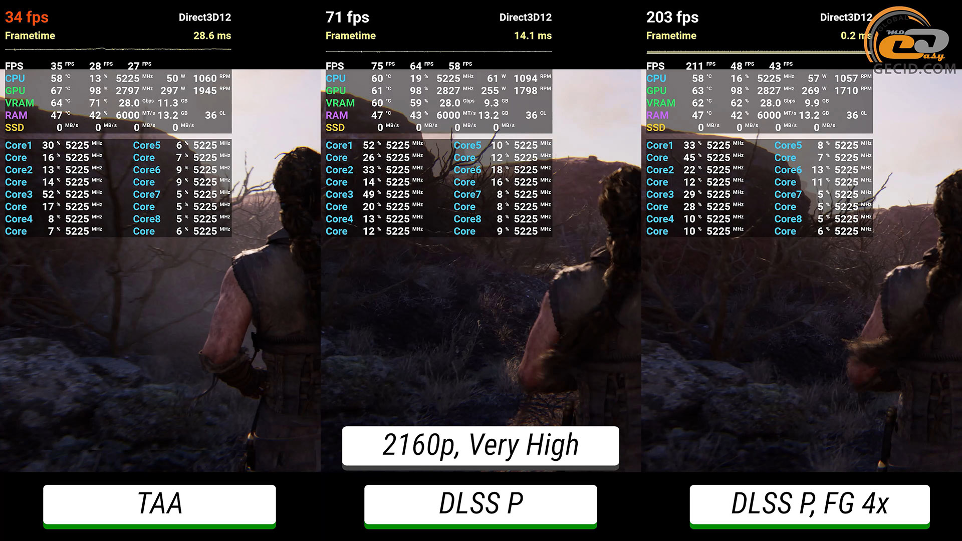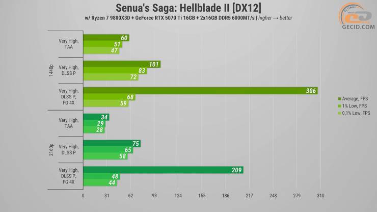 На недавно добавленном Very High пресете графики побегать в Senua's Saga: Hellblade II можно и при нативной картинке, однако частота кадров не всегда стабильно остается на уровне 60 — иногда встречаются короткие подергивания или проседания. В обоих случаях с добавленным DLSS4 и генератором кадров инновационные технологии позволяют получить максимум удовольствия от процесса игры.