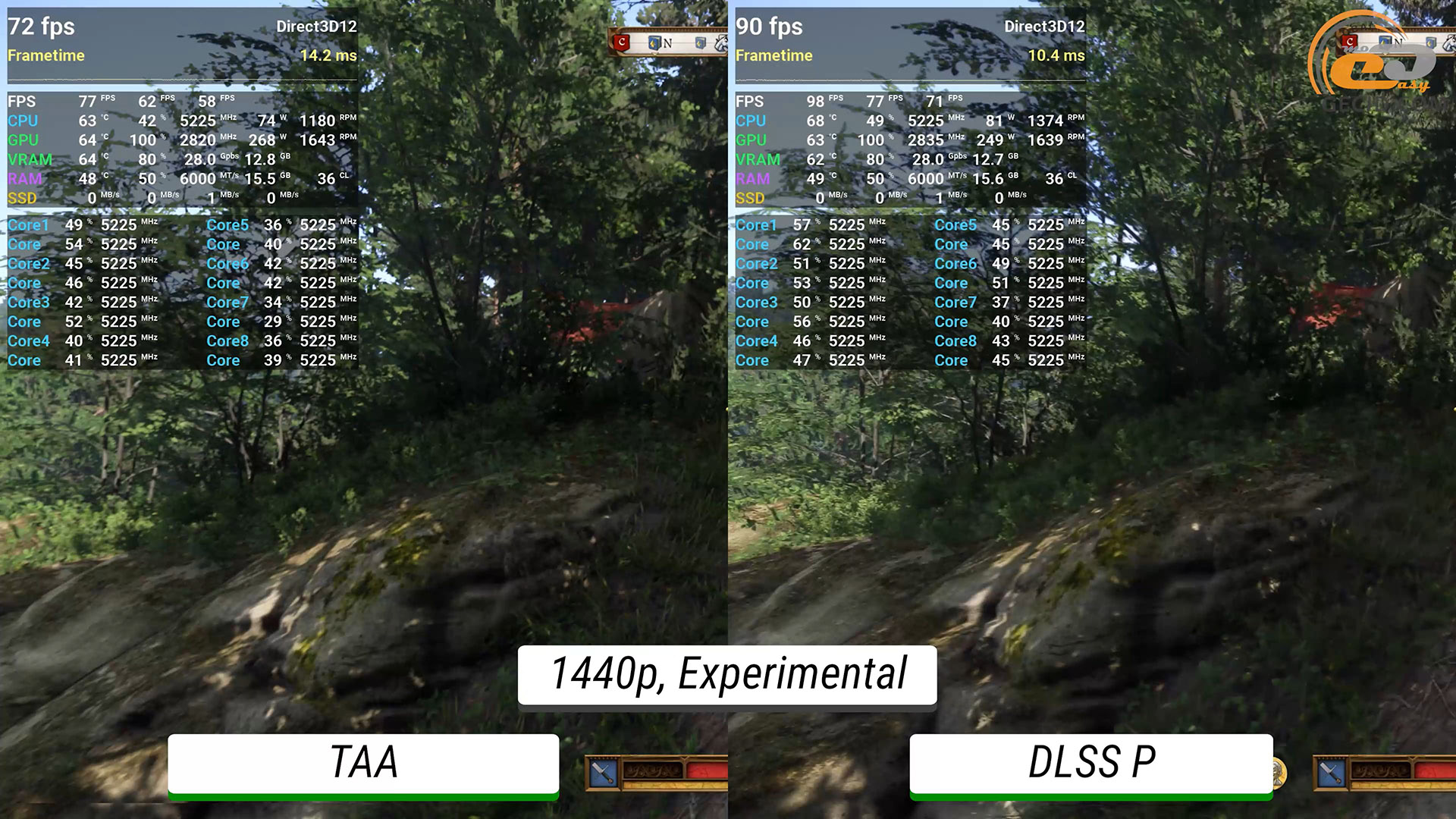 В Kingdom Come: Deliverance II можно применить самый тяжелый и условно нерекомендуемый экспериментальный пресет графики. В густом лесу, например, в лагере цыган, геймплей комфортный, хотя частота кадров иногда и пытается опуститься до «минимальных» 60 FPS. С добавлением DLSS в режиме Transformer сразу замечаем лучшую детализацию растительности и небольших элементов, особенно вдали, а также заметно лучшую четкость. К сожалению, игра полноценно не поддерживает генератор кадров и не разрешает протестировать в ней его возможности.