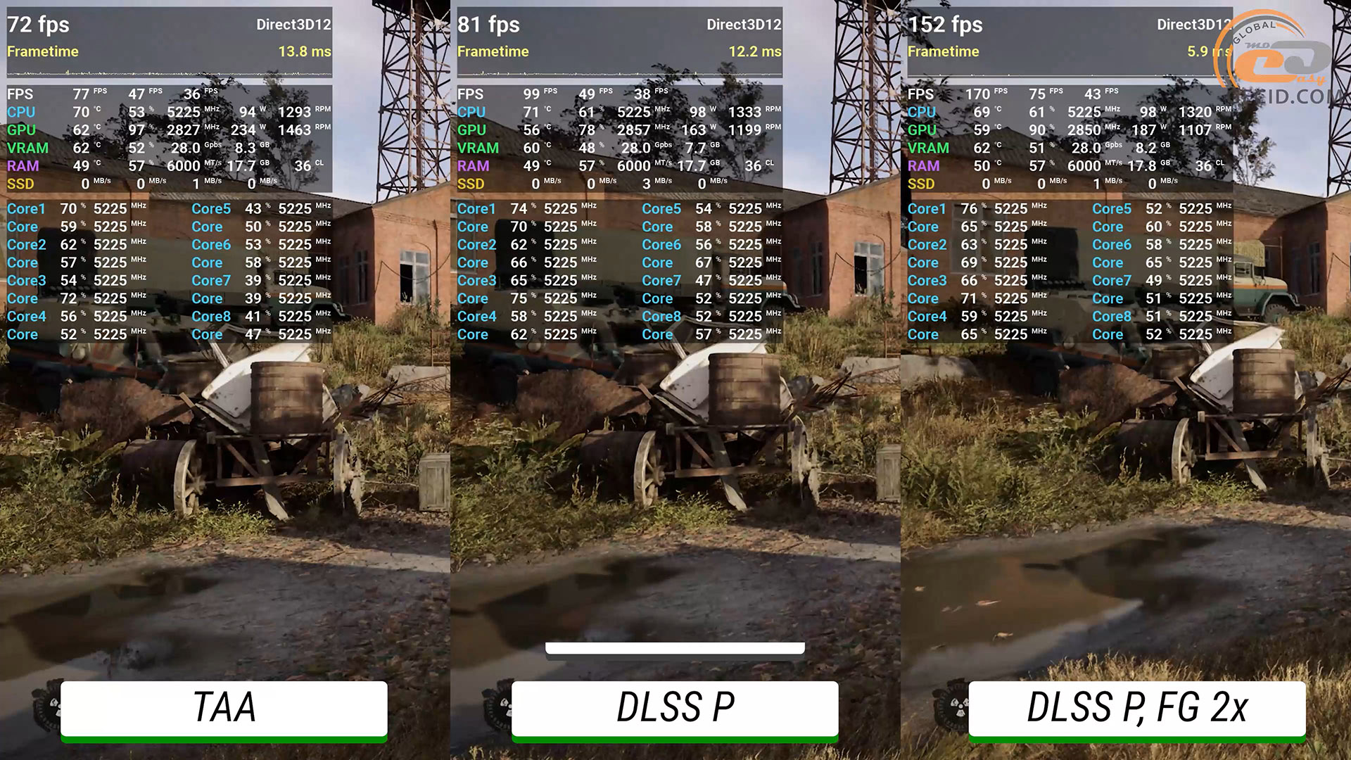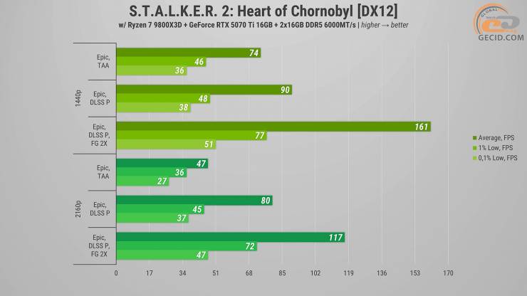 В S.T.A.L.K.E.R. 2: Сердце Чернобыля на эпических настройках при 1440p даже в нативном разрешении игровой процесс достаточно комфортный. Конечно, есть определенные проблемы с производительностью и плавностью, особенно в локациях с большим количеством NPC. И это, к сожалению, является «нормальным» состоянием игры. С производительным DLSS частота кадров становится больше, а общая плавность несколько улучшается, однако проблемы не исчезают полностью. Хотя игра и поддерживает лишь двухкратную генерацию кадров, видеоряд все равно выглядит плавным и не очень «испорченным».