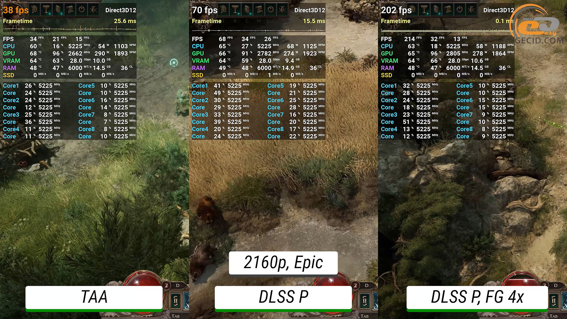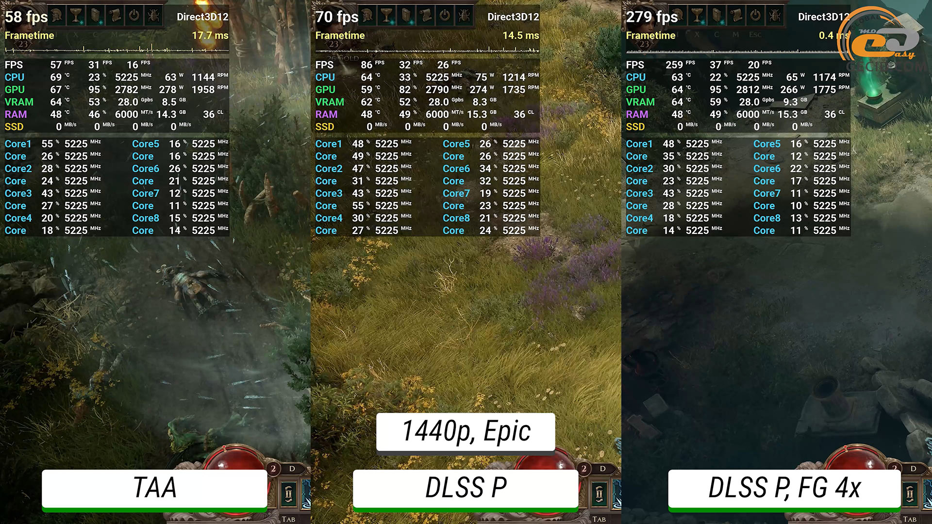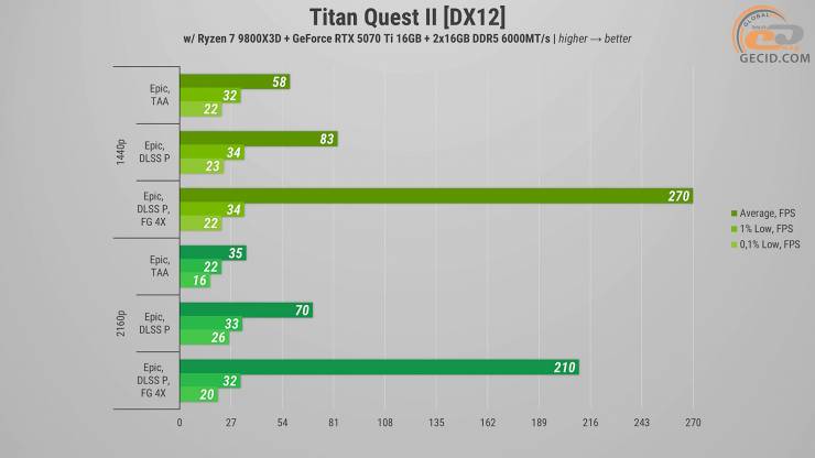 Также интересно посмотреть на производительность в новой RPG Titan Quest II. На эпических и максимально доступных настройках графики иногда прослеживаются определенные проблемы с оптимизацией, на которые разработчикам еще предстоит обратить внимание. Это приводит к некоторым просадкам ниже 50 FPS и коротким подергиваниям. Активация DLSS не только предоставляет дополнительные кадры, но и улучшает визуальную сторону. А генератор кадров придает игре дополнительную плавность.