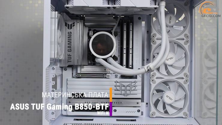Основной звездой сборки является материнская плата ASUS TUF Gaming B850-BTF WIFI W форм-фактора ATX – яркий пример того, как инновационная инженерная идея может изменить не только внешний вид ПК, но и сам процесс его сборки. Модель принадлежит к новому поколению решений с концепцией BTF 2.0, главная фишка которой – перенос большинства разъемов подключения на тыльную сторону текстолита.