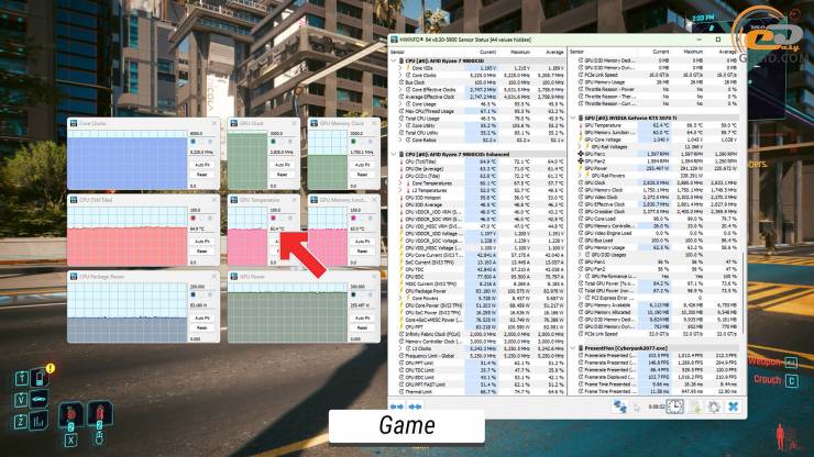 На примере Cyberpunk 2077 можно увидеть, что при игровой нагрузке видеокарта греется на 5 градусов меньше, чем в бенчмарке, а рабочие частоты увеличиваются примерно на 200 МГц. В свою очередь нагрузка на процессор здесь не такая высокая, поэтому его температура колеблется от 65 до 66 градусов.