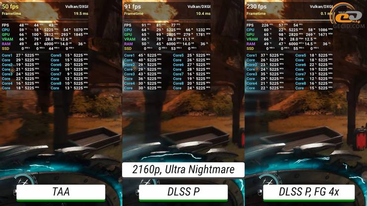 Однако теперь использование производительного режима апскейлинга заметно улучшает уровень производительности и позволяет иметь около 120 средних кадров в секунду. Что касается фрейм-генератора, то после его активации ситуация становится совсем идеальной.
