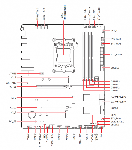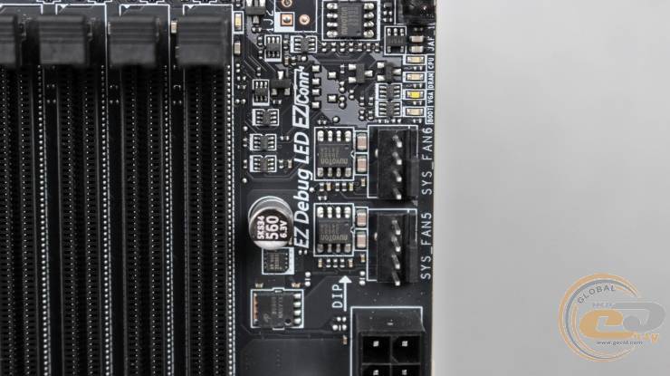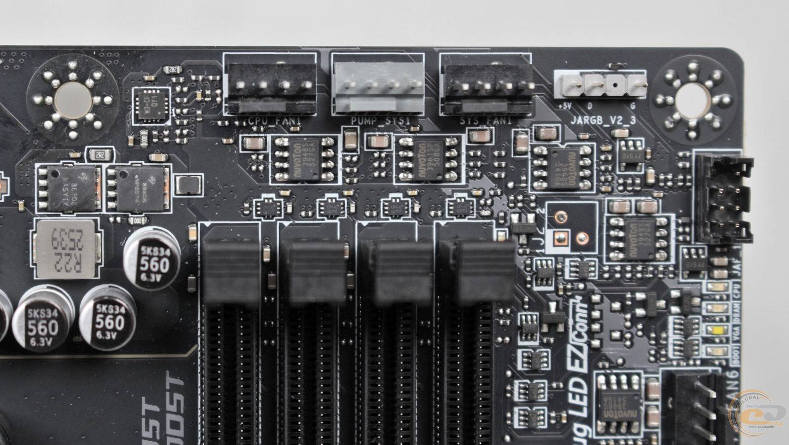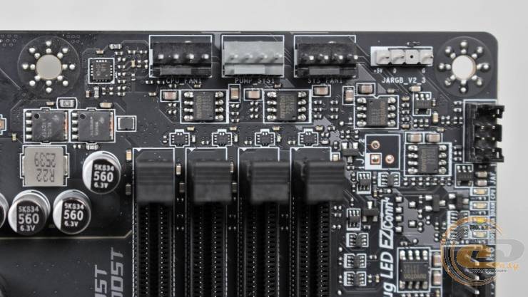 В верхней правой части платы расположено целых пять 4-контактных разъемов FAN: два для процессорного охладителя или помпы СЖО и три для корпусных вентиляторов. Также здесь есть колодка адресной LED-подсветки и разъема JAF_1 для одновременного подключения вентилятора и RGB-подсветки. А для обнаружения ошибок предусмотрены четыре светодиодных индикатора загрузки системы и один индикатор инициализации памяти.