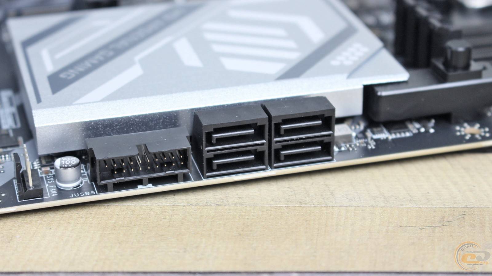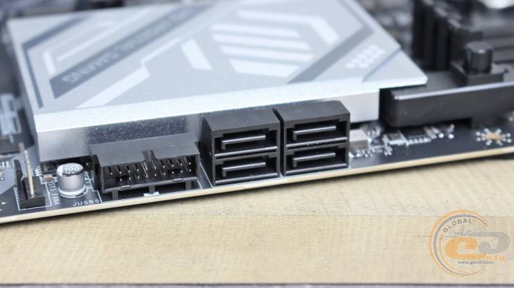 Ниже рядом с радиатором чипсета вдоль правого края платы распаяны четыре порта SATA 6 Гбит/с и колодка USB 3.2 Gen 1 с пропускной способностью до 5 Гбит/с. Горизонтальная компоновка позволит использовать данные элементы даже при установке в слоты расширения очень габаритных видеокарт или других устройств. Также здесь есть еще один разъем для подключения корпусного вентилятора.