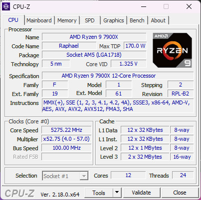 При нагрузке нашего 12-ядерного AMD Ryzen 9 7900X стресс-тестом утилиты CPU-Z процессор держал стабильные 5,28 ГГц при напряжении 1,325 В — довольно хороший показатель.