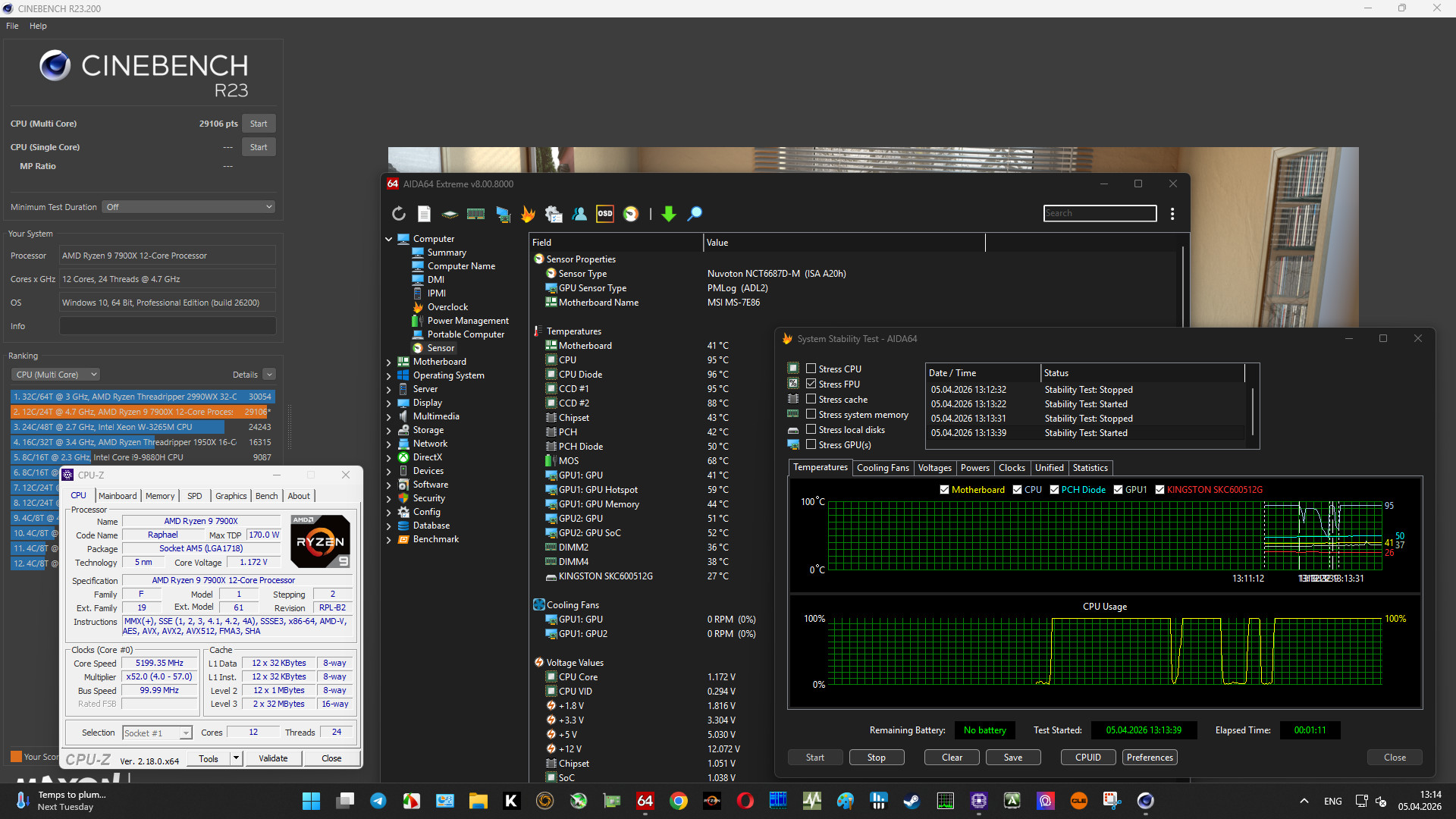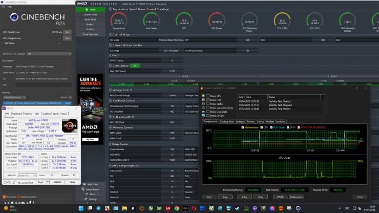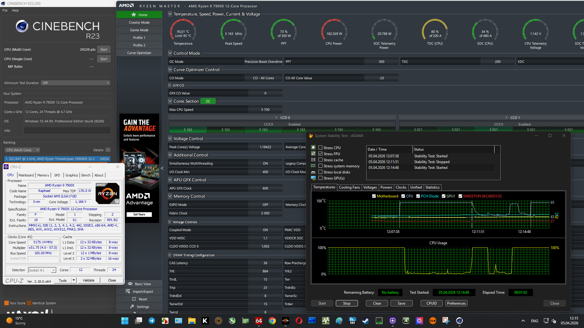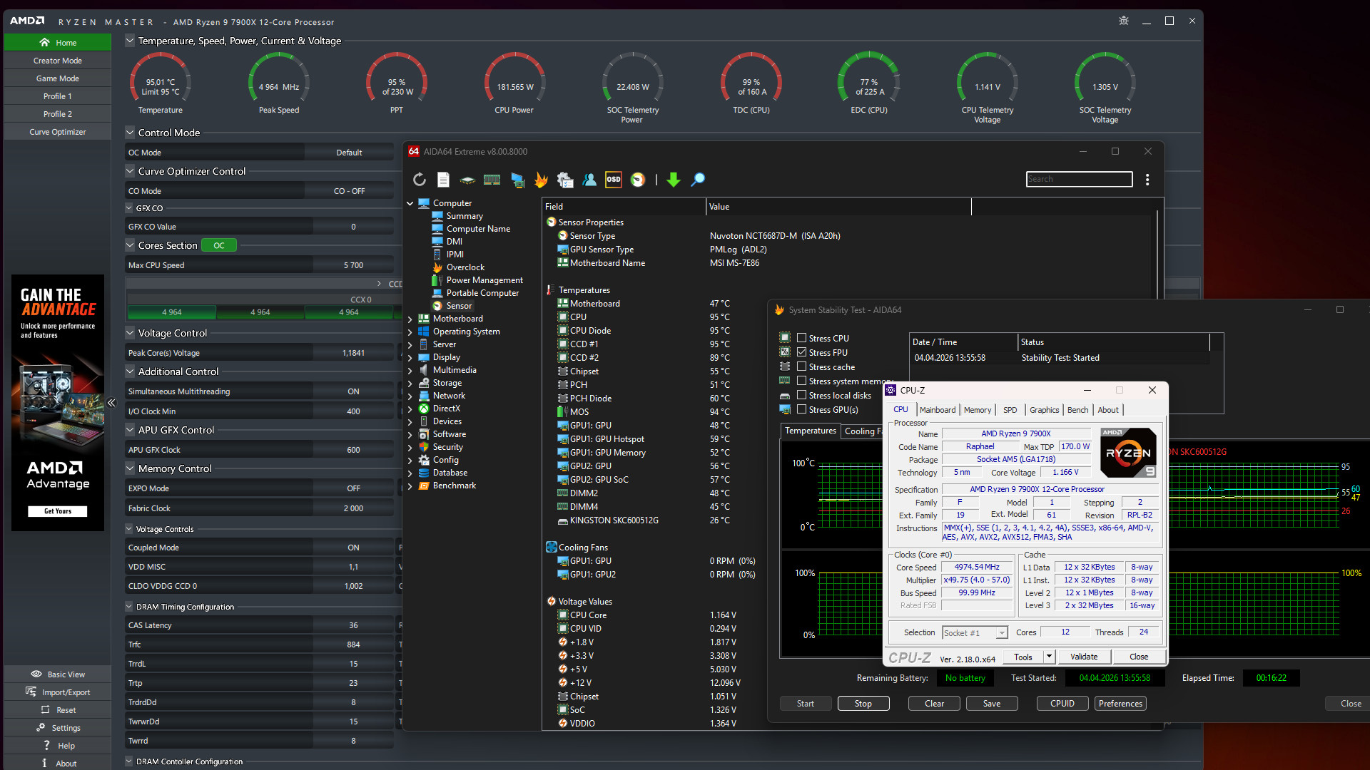 В более требовательном 16-минутном FPU Stress Test в AIDA64 частота ядер просела до 4,97 ГГц при напряжении 1,166 В. При этом температура процессора достигала 95°C, что соответствует максимальному рабочему значению (Tjmax), а сам он потреблял 182 Вт. Поскольку AMD Ryzen 9 7900X работал на предельной для него температуре, мы решили выполнить андервольтинг и одновременно его подразогнать. Для этого в BIOS были изменены следующие параметры: