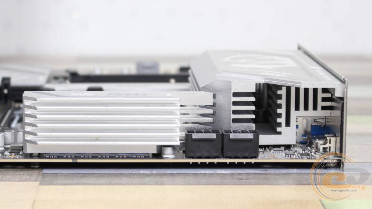 Теперь к деталям. Подсистема питания процессора включает в себя пару больших радиаторов, один из которых при этом выполняет роль кожуха интерфейсной панели.