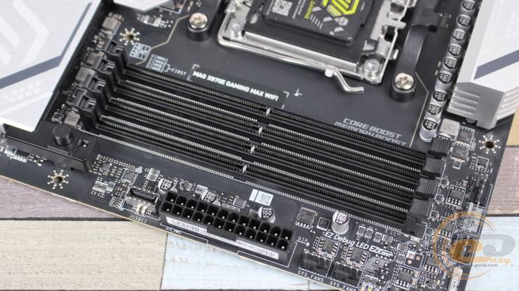 Четыре DIMM-слота с фиксаторами сверху поддерживают модули памяти DDR5 общим объемом 256 ГБ и скоростью до 8200+ МТ/с. Если установить сразу пару 1-ранговых модулей, это значение снижается до 6400+ МТ/с, а для 2-ранговых — до 6000+ МТ/с.