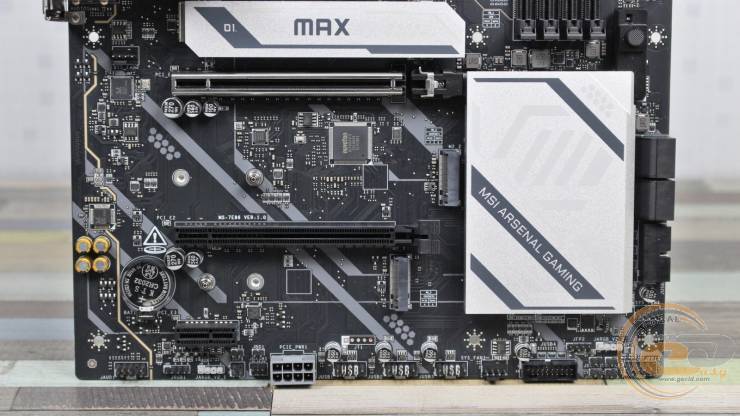 На обороте, кроме усилительной пластины процессорного разъема, находятся крепежные винты четырех радиаторов. Есть здесь и традиционная для плат MSI дополнительная краска вокруг крепежных отверстий для защиты при установке.