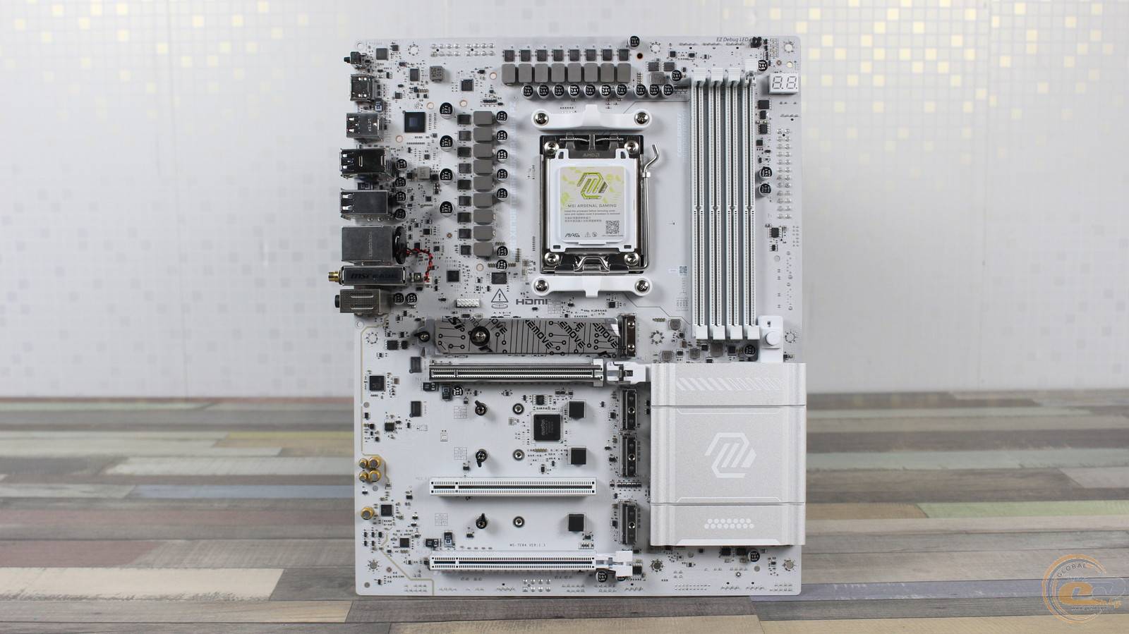 Внешне новинка также имеет много общего с MSI MAG X870E TOMAHAWK WIFI. Самые заметные изменения состоят в более светлом цветовом оформлении, другой форме радиаторов и наличии металлических декоративных вставок по периметру — как раз в тех местах, где обычно располагаются разъемы. Некоторые элементы также изменили местоположение — в частности, дисплей для вывода диагностических кодов и светодиодные индикаторы «переехали» в верхнюю часть платы.