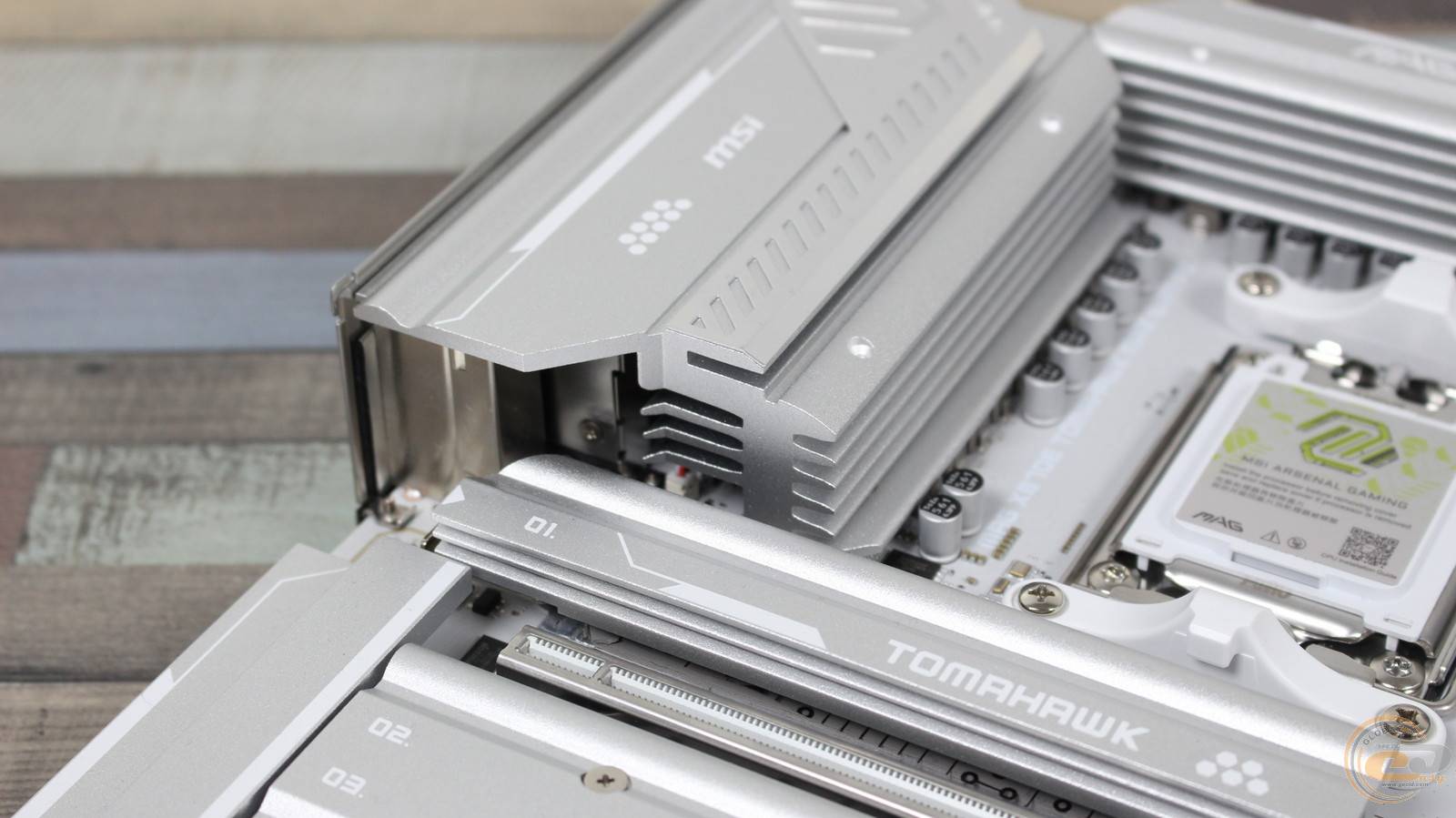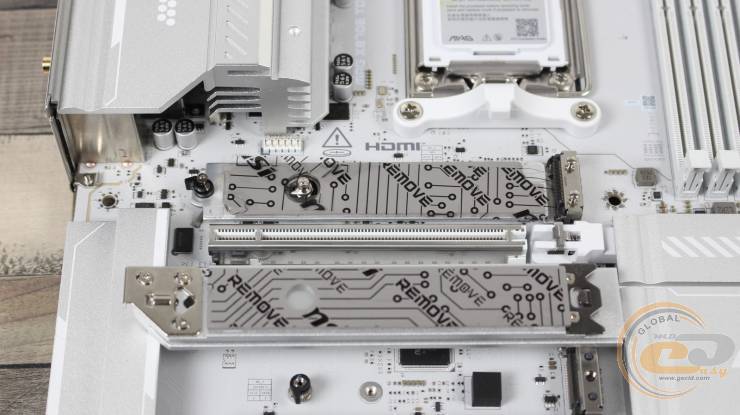 Верхний слот оснащен радиатором с фиксатором EZ M.2 Shield Frozr II для его быстрого снятия и установки. Дополнительное охлаждение предусмотрено и печатной платой. В обоих случаях присутствуют термопрокладки, защищенные заводской пленкой, которые необходимо снять перед установкой SSD.