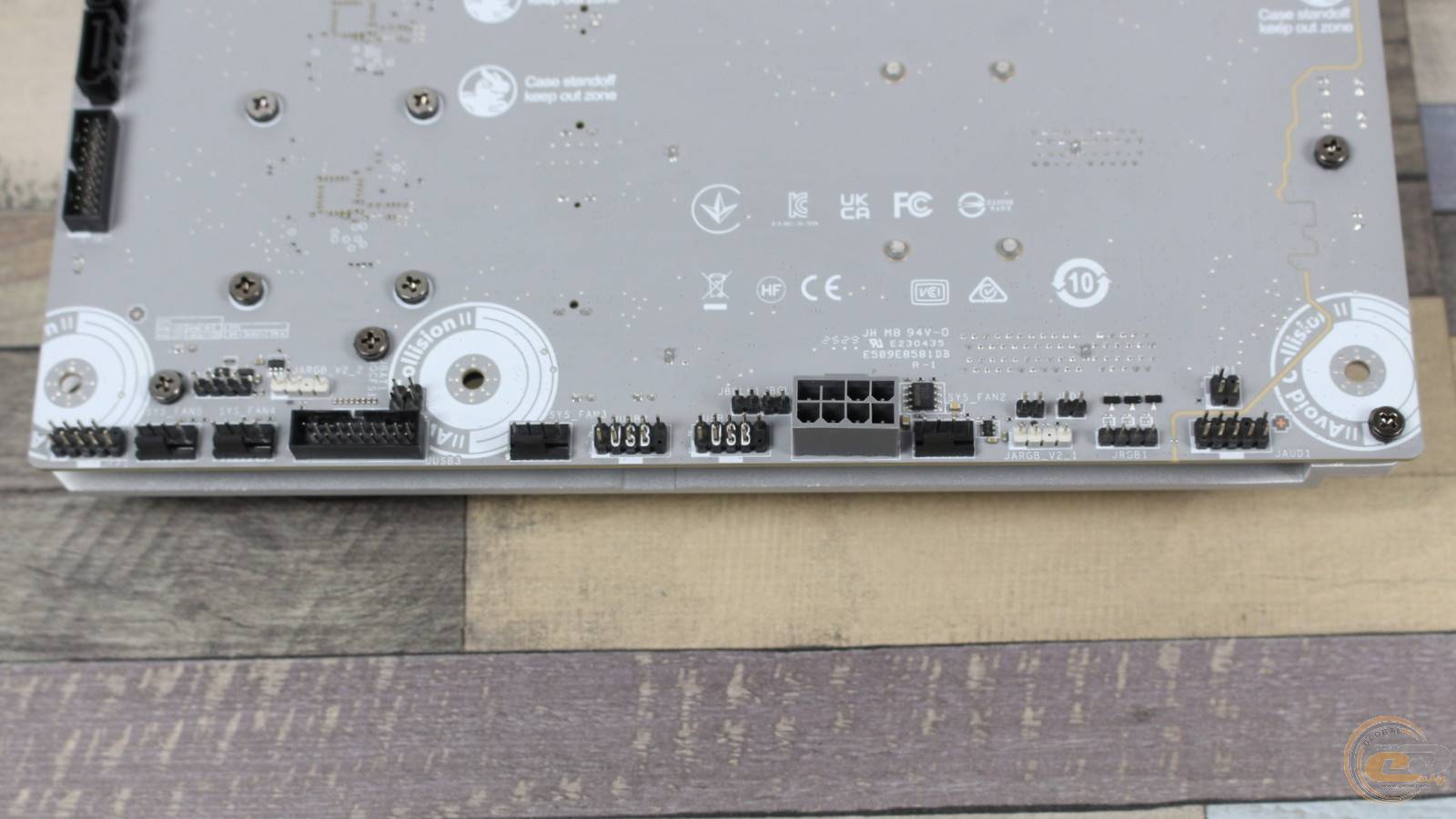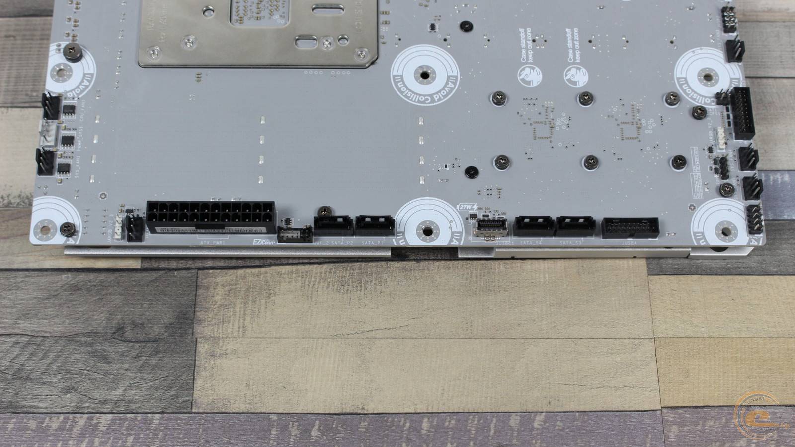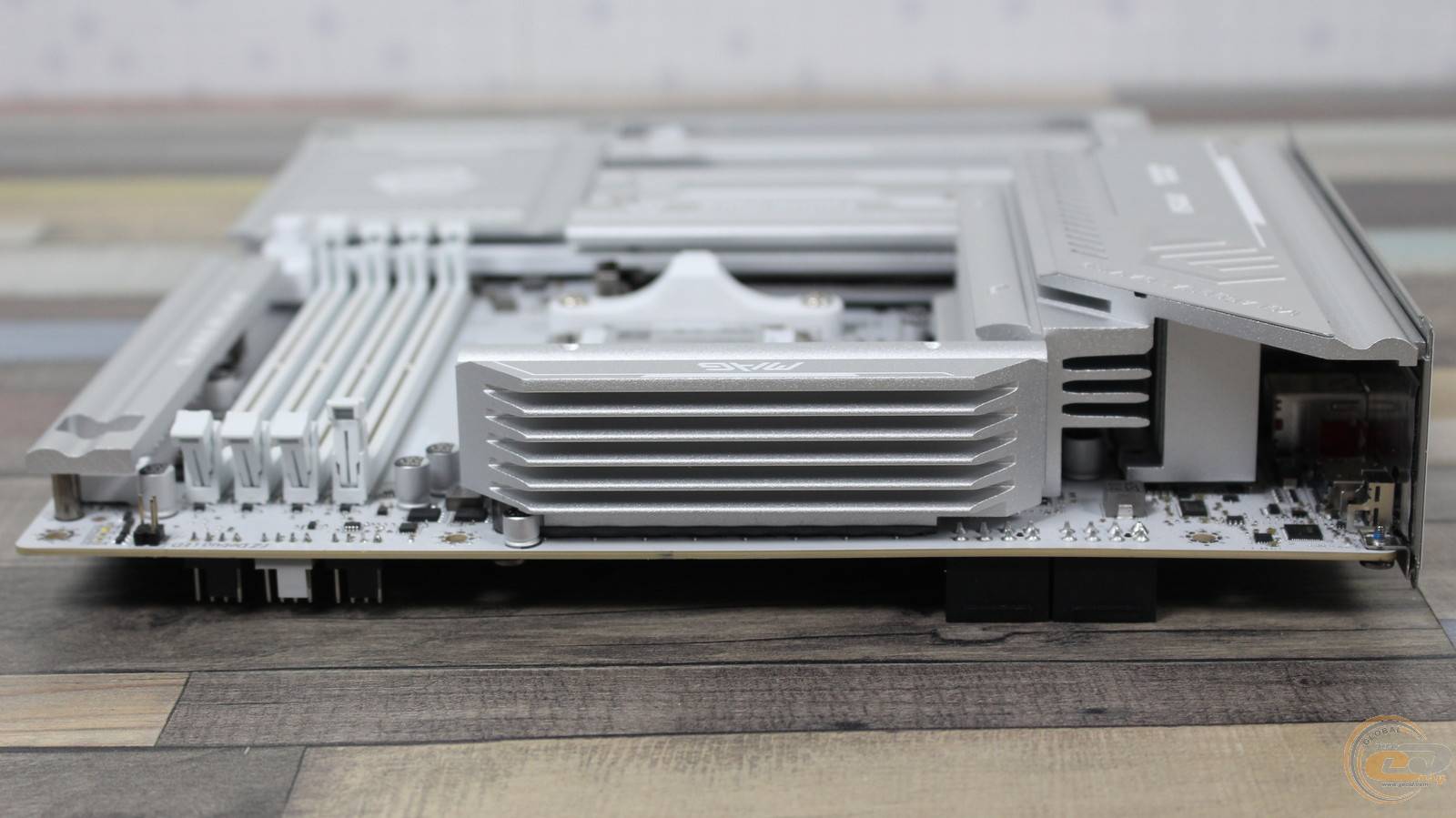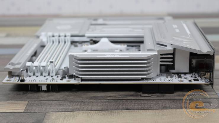 Вдоль правого борта расположена декоративная металлическая накладка. Похожие элементы есть также вдоль нижнего края платы и с левой стороны, прикрывая места, где у обычных материнских плат расположены колодки и разъемы.