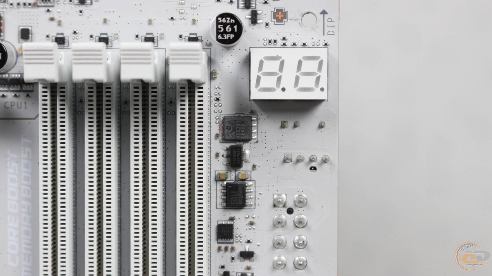 Здесь же присутствует очень полезное табло для вывода шестнадцатеричного кода в случае возникновения системной ошибки. Еще один индикатор сигнализирует об отсутствии питания на модулях памяти. Также здесь есть четыре светодиода, которые информируют о возникновении ошибок в процессе загрузки системы.