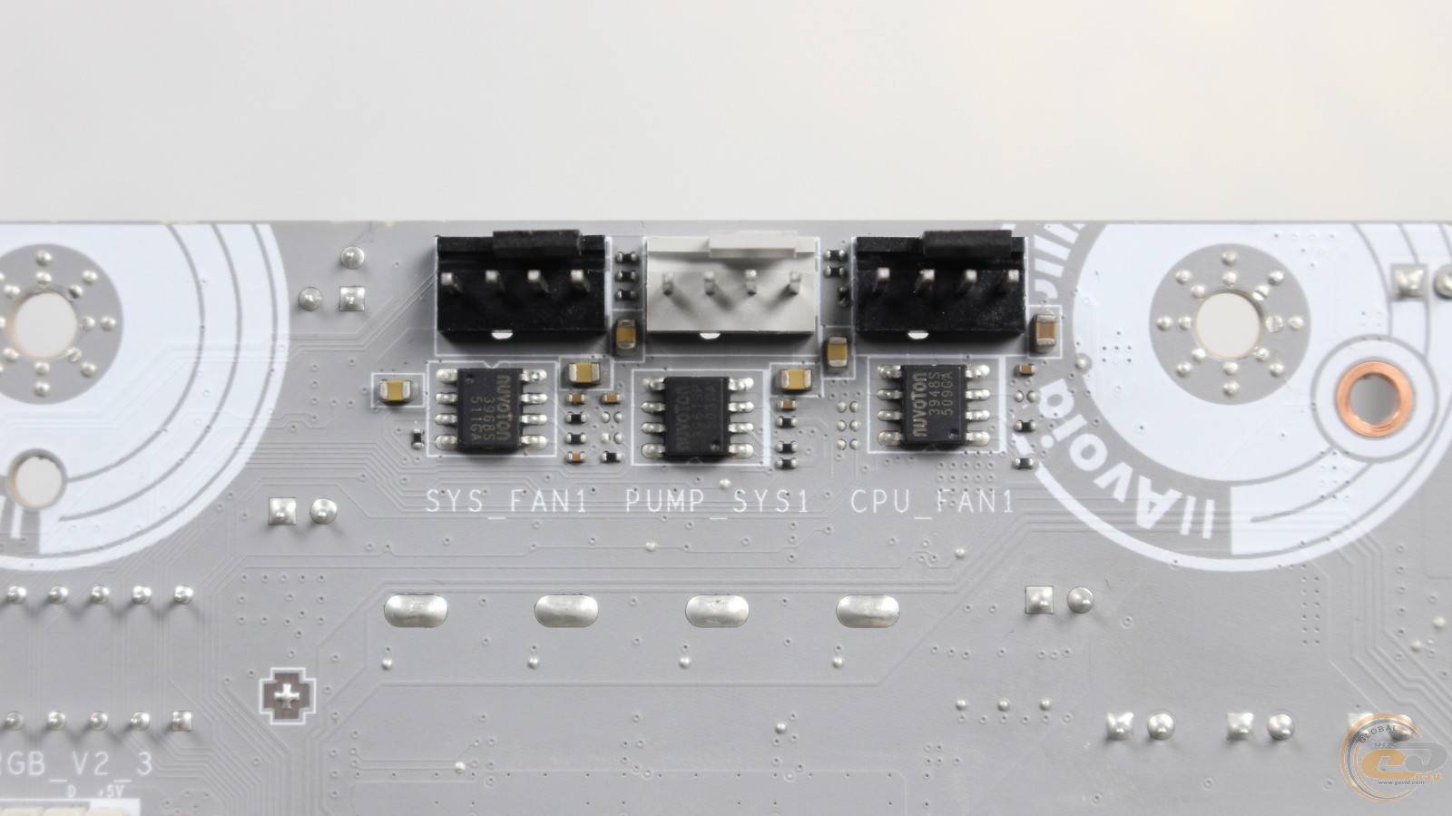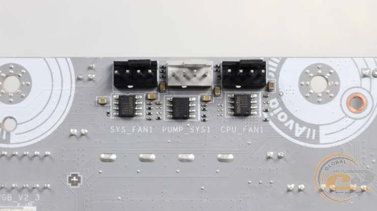 С противоположной стороны распаяны три 4-контактных коннектора для подключения процессорного кулера, помпы и корпусного вентилятора.