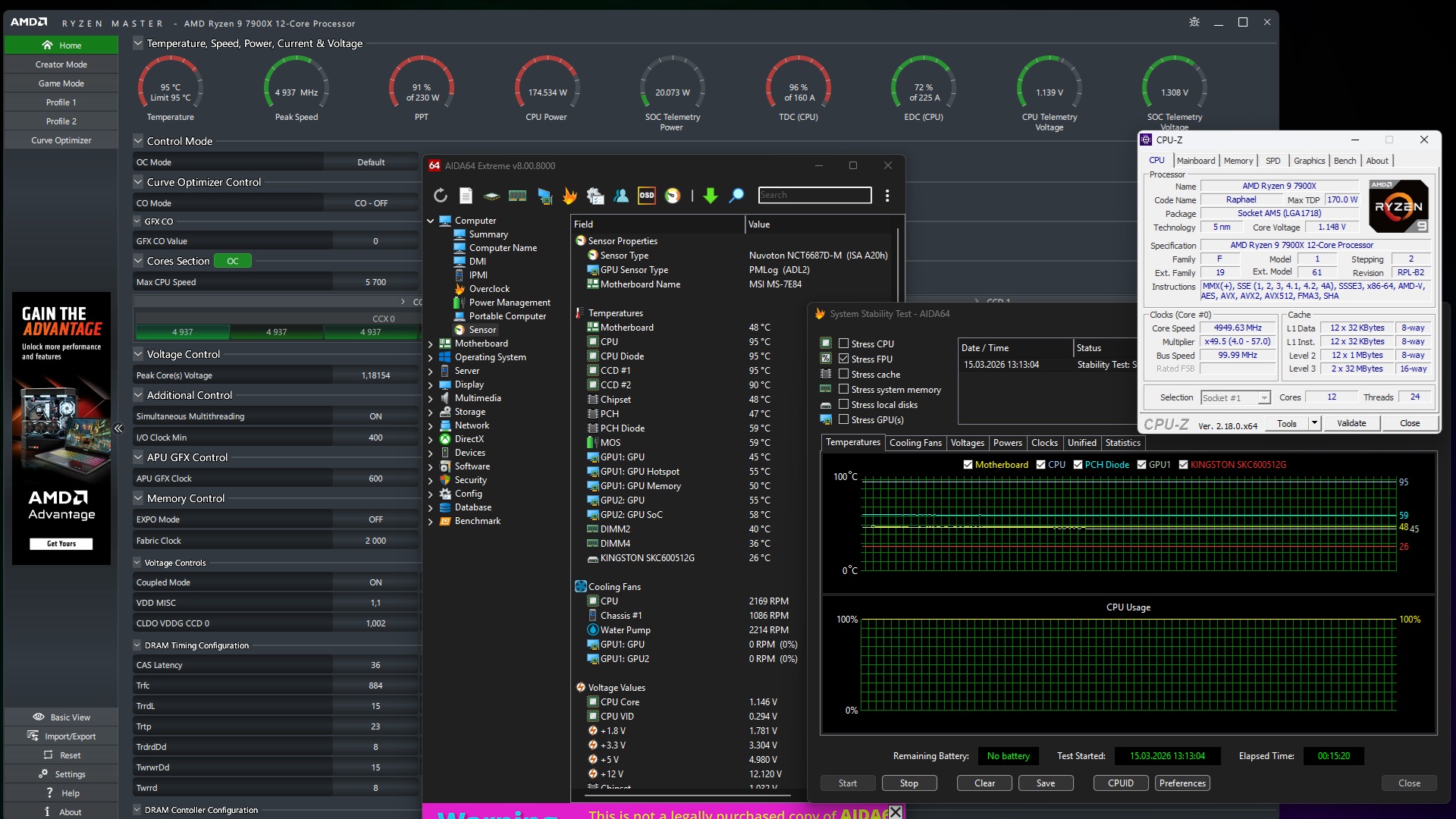 В более требовательном 15-минутном FPU Stress Test в AIDA64 частота ядер просела до 4,9 ГГц при напряжении 1,148 В. А вот температура процессора достигала 95°C, что соответствует максимальному рабочему значению (Tjmax).