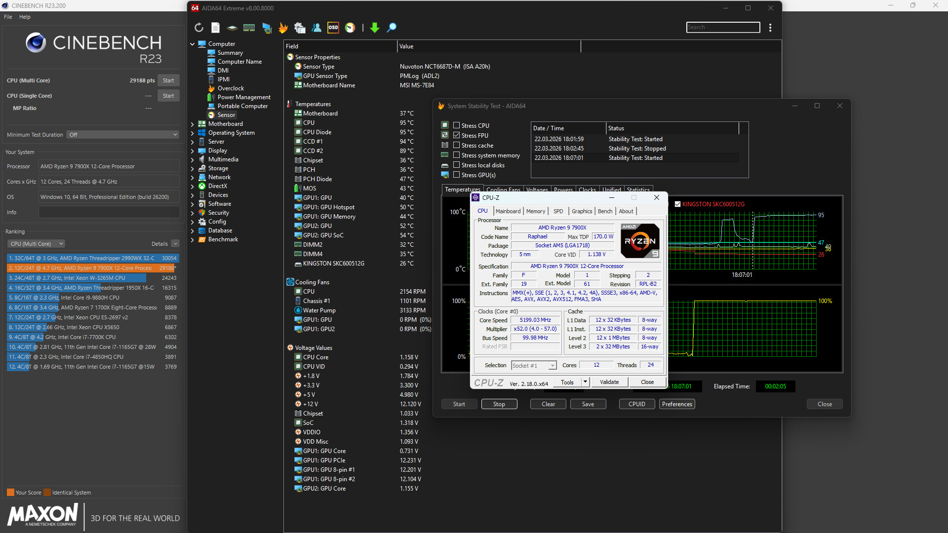 В свою очередь, в FPU Stress Test 12-ядерник "держал" частоту 5,2 ГГц, что на 300 МГц выше предыдущего результата. Напряжение при этом составляло всего 1,138 В, а температура оставалась в пределах тех же 95°C. При этом никаких проблем со стабильностью не было – материнская плата отработала отлично.