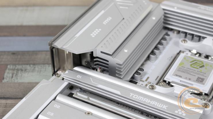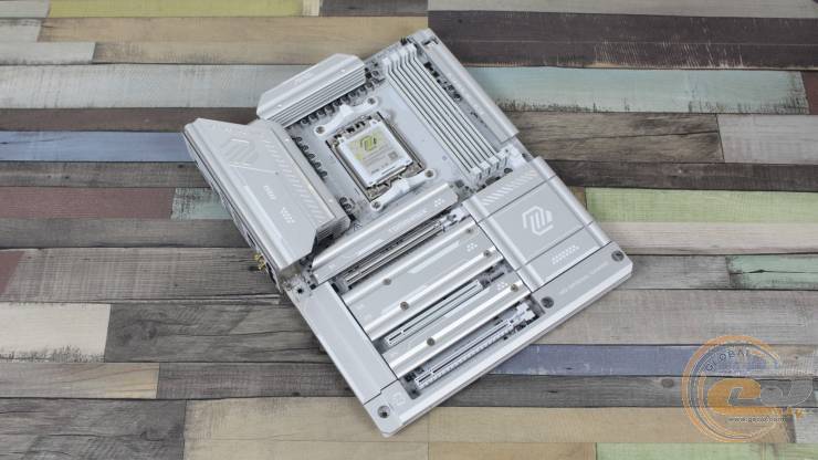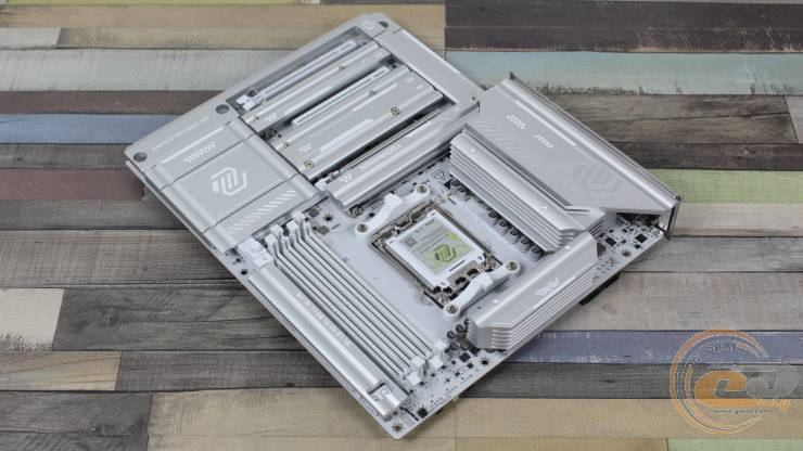 Радиатор чипсета простирается до края платы. Под ним расположен топовый набор логики AMD X870E, предлагающий максимум возможностей. За 15 минут теста AIDA FPU охладитель нагрелся до 46°C, что является отличным показателем (при температуре в помещении 25°C).