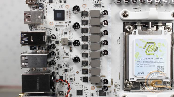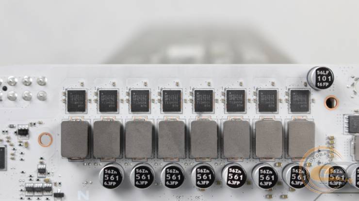 Рядом с ними распаяны надежные твердотельные конденсаторы. Что касается зоны VRM, то здесь используется 14(80 А)+2+1-фазная схема питания под управлением контроллера IT8857FN.