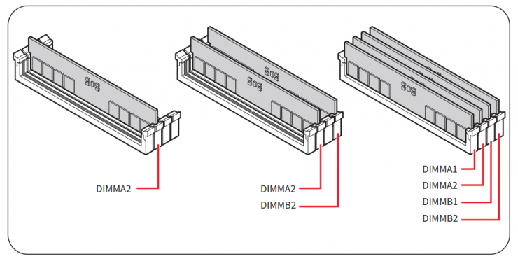 С правой стороны платы расположены четыре DIMM-слота с фиксаторами по обе стороны. Они поддерживают модули ОЗУ стандарта DDR5 общим объемом до 256 ГБ и скоростью до 8400+ МТ/с. Правда, при использовании сразу нескольких планок или двухранговых модулей это значение снижается до 6400+ МТ/с. Согласно руководству пользователя, для двух модулей памяти приоритетными традиционно являются слоты A2 и B2, а для одного - A2.